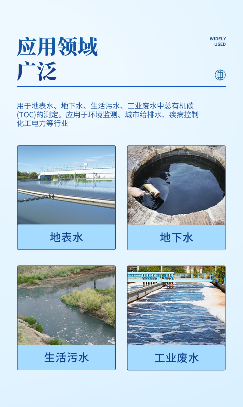地表水、地下水、生活污水、工業(yè)廢水中總有機碳(TOC)的測定,應用于環(huán)境監(jiān)測、城市給排水、疾病控制、化工電力等行業(yè)。