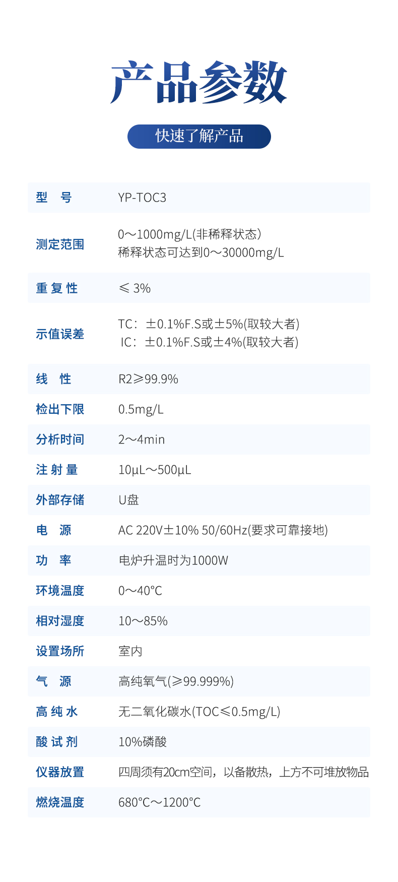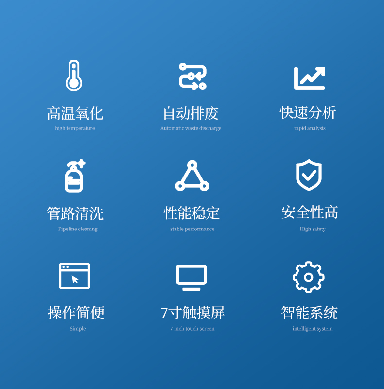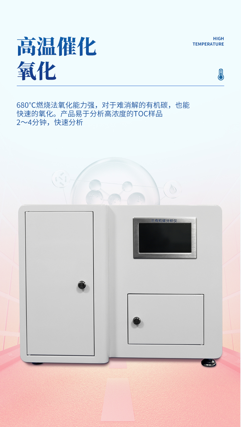 1.高溫催化氧化,對于難消解的有機碳,也能高效率的氧化,使得產(chǎn)品易于分析高濃度的TOC樣品;