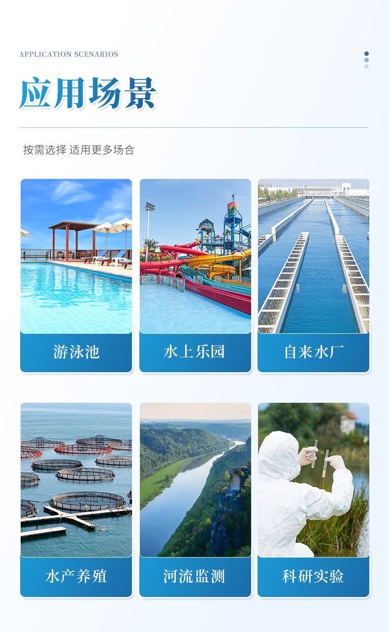 適用于游泳場館、戶內(nèi)外游泳池、水上樂園、溫泉浴池、純凈水廠、自來水廠、生活污水處理廠、工業(yè)污水、水產(chǎn)養(yǎng)殖、河流監(jiān)測、水源保護(hù)、生產(chǎn)監(jiān)測、科研實驗等。