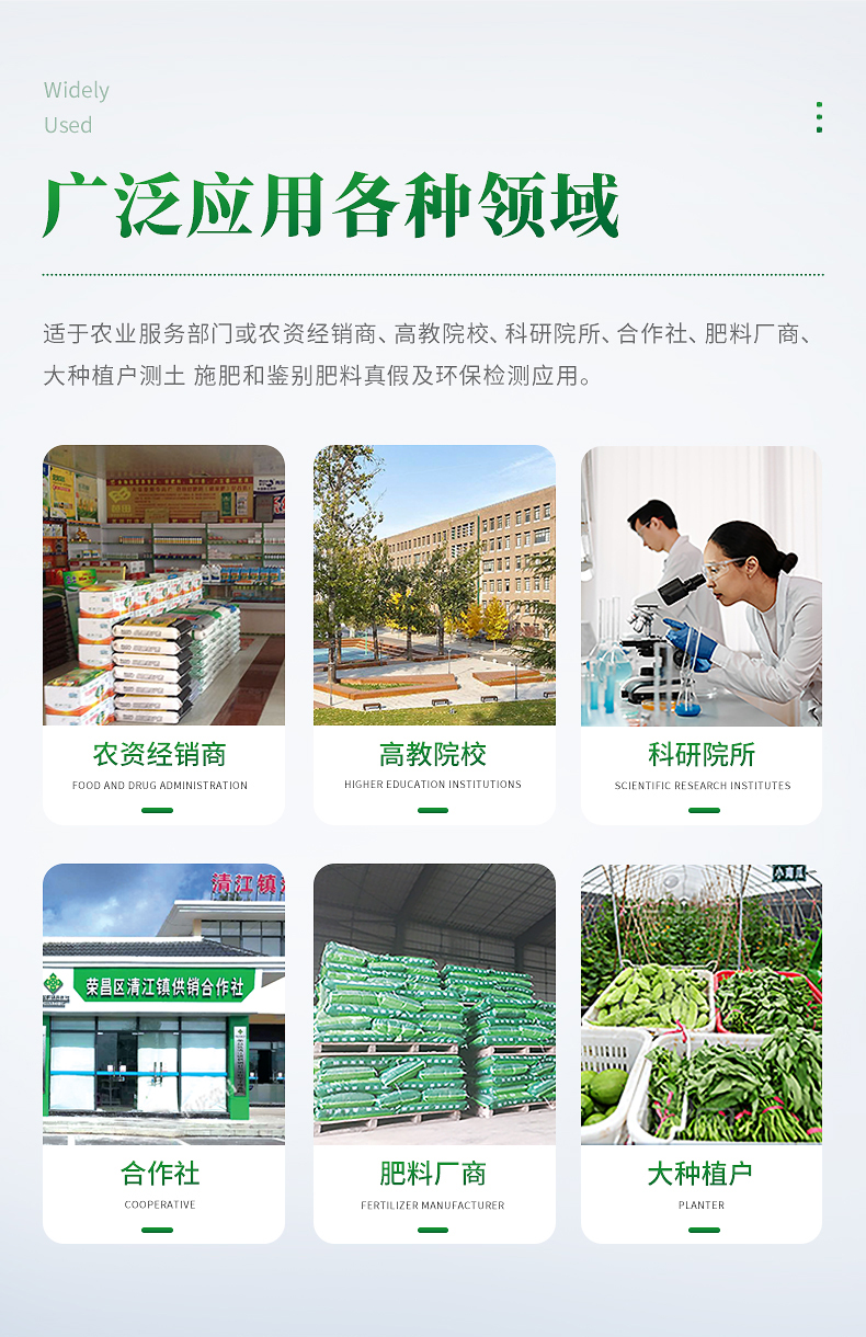 配套齊全:該儀器集藥、器、儀為一體,攜帶方便,相當(dāng)于一個小型移動實(shí)驗(yàn)室,無需用戶自配附件,亦可靈活野外流動測試。適于農(nóng)業(yè)服務(wù)部門或農(nóng)資經(jīng)銷商、高教院校、科研院所、合作社、肥料廠商、大種植戶測土施肥和鑒別肥料真假及環(huán)保檢測應(yīng)用。