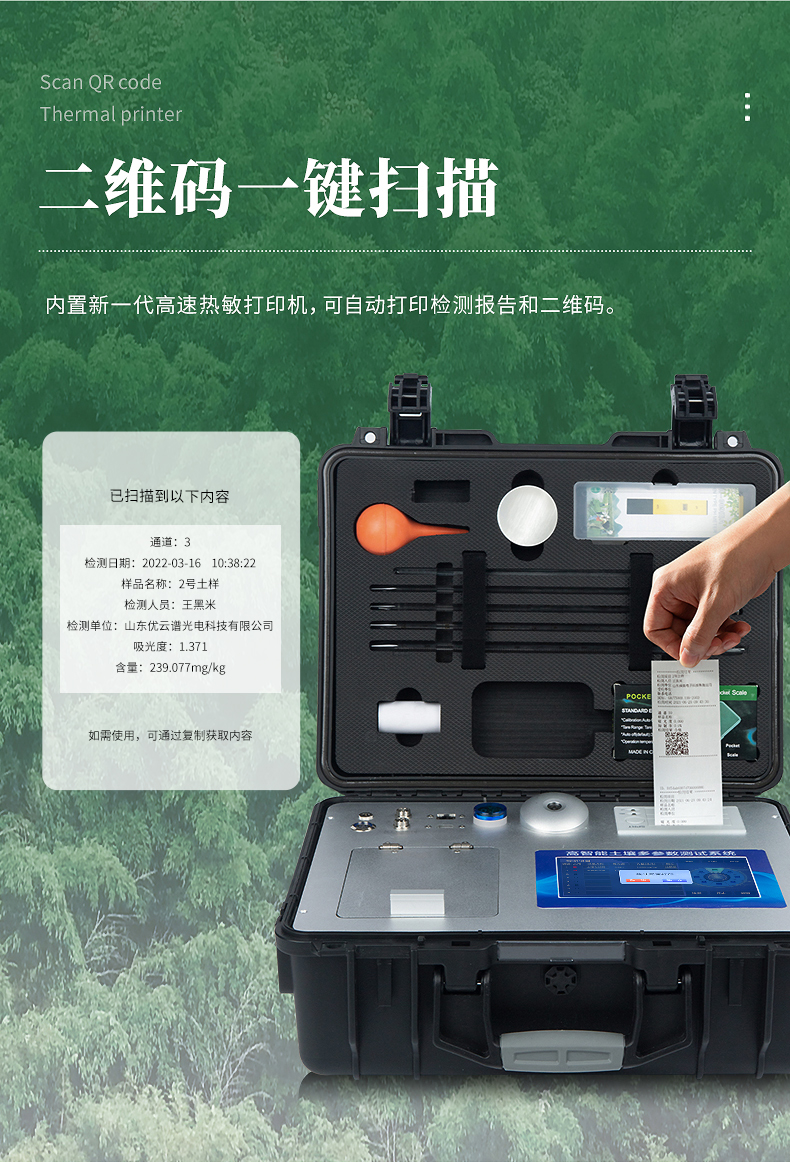 21、內(nèi)置新一代高速熱敏打印機(jī)(無需色帶),打印內(nèi)容包含:檢測單位、檢測人員、檢測項(xiàng)目、通道號、吸光度、養(yǎng)分含量(mg/kg)、檢測時間、以及二維碼等信息