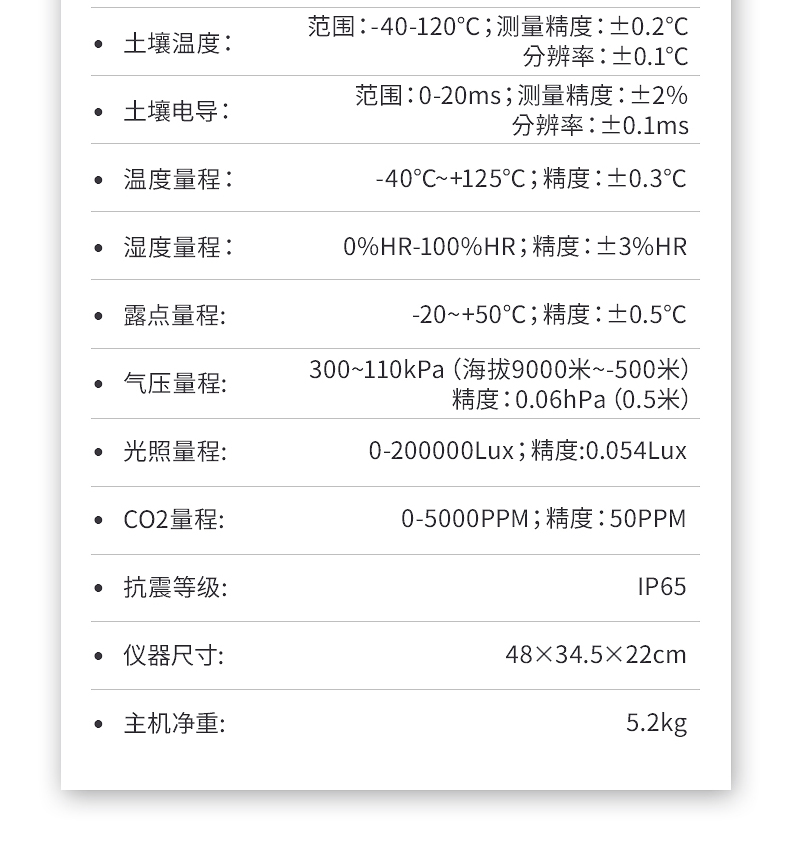 2、環(huán)境:土壤濕度、土壤溫度、土壤電導(dǎo)率、空氣溫度、空氣濕度、露點(diǎn)、大氣壓力、光照度、二氧化碳;