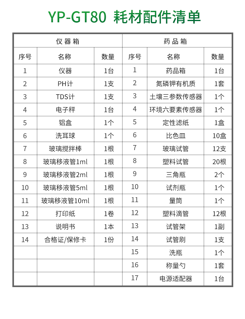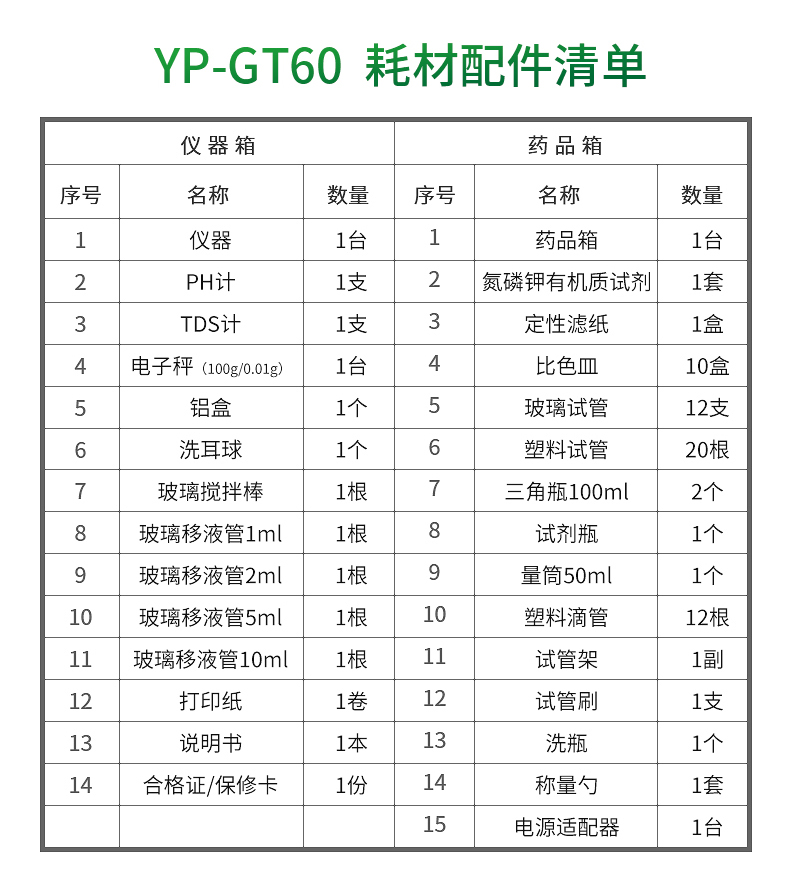 | 2 | PH計 | 1支 | 2 | 氮磷鉀有機(jī)質(zhì)試劑 | 1套 |