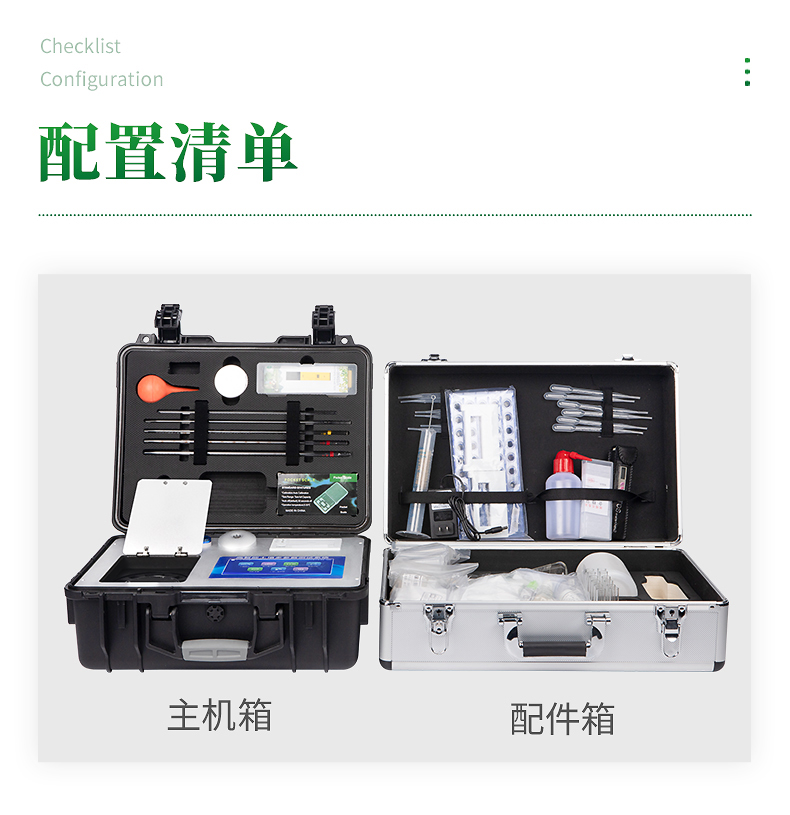 配套齊全:該儀器集藥、器、儀為一體,攜帶方便,相當(dāng)于一個小型移動實驗室,無需用戶自配附件,亦可靈活野外流動測試。適于農(nóng)業(yè)服務(wù)部門或農(nóng)資經(jīng)銷商、高教院校、科研院所、合作社、肥料廠商、大種植戶測土施肥和鑒別肥料真假及環(huán)保檢測應(yīng)用。