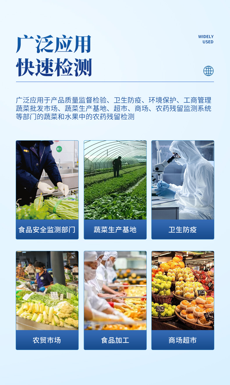 它可以廣泛應(yīng)用于產(chǎn)品質(zhì)量監(jiān)督檢驗、衛(wèi)生防疫、環(huán)境保護(hù)、工商管理、蔬菜批發(fā)市場、蔬菜生產(chǎn)基地、超市、商場、農(nóng)藥殘留監(jiān)測系統(tǒng)等部門的蔬菜和水果中的農(nóng)藥殘留檢測。