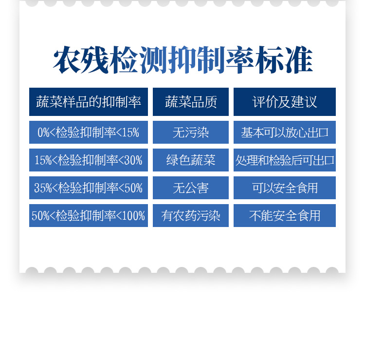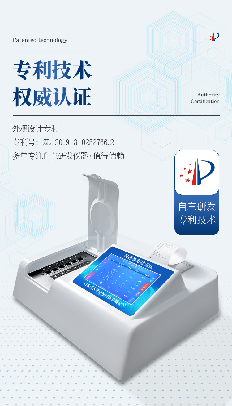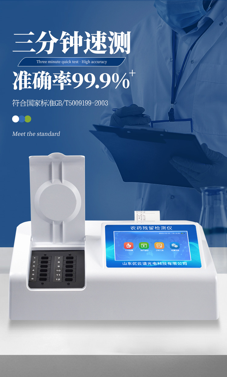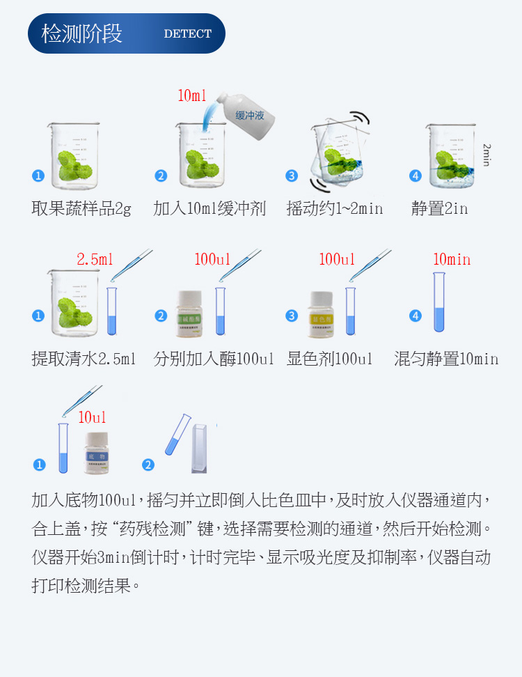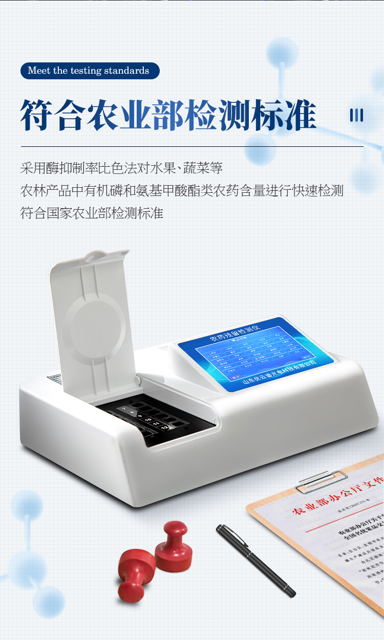 檢測標(biāo)準(zhǔn):依據(jù)國家標(biāo)準(zhǔn)方法(GB/T5009.199-2003)以及世界衛(wèi)生組織WHO、世界糧農(nóng)組織FAO殘留農(nóng)藥檢測標(biāo)準(zhǔn)、世界環(huán)境保護(hù)局EPA參照攝入量等要求來設(shè)計。采用酶抑制率比色法對水果、蔬菜等農(nóng)林產(chǎn)品中有機磷和氨基甲酸酯類農(nóng)藥含量進(jìn)行快速準(zhǔn)確的檢測。