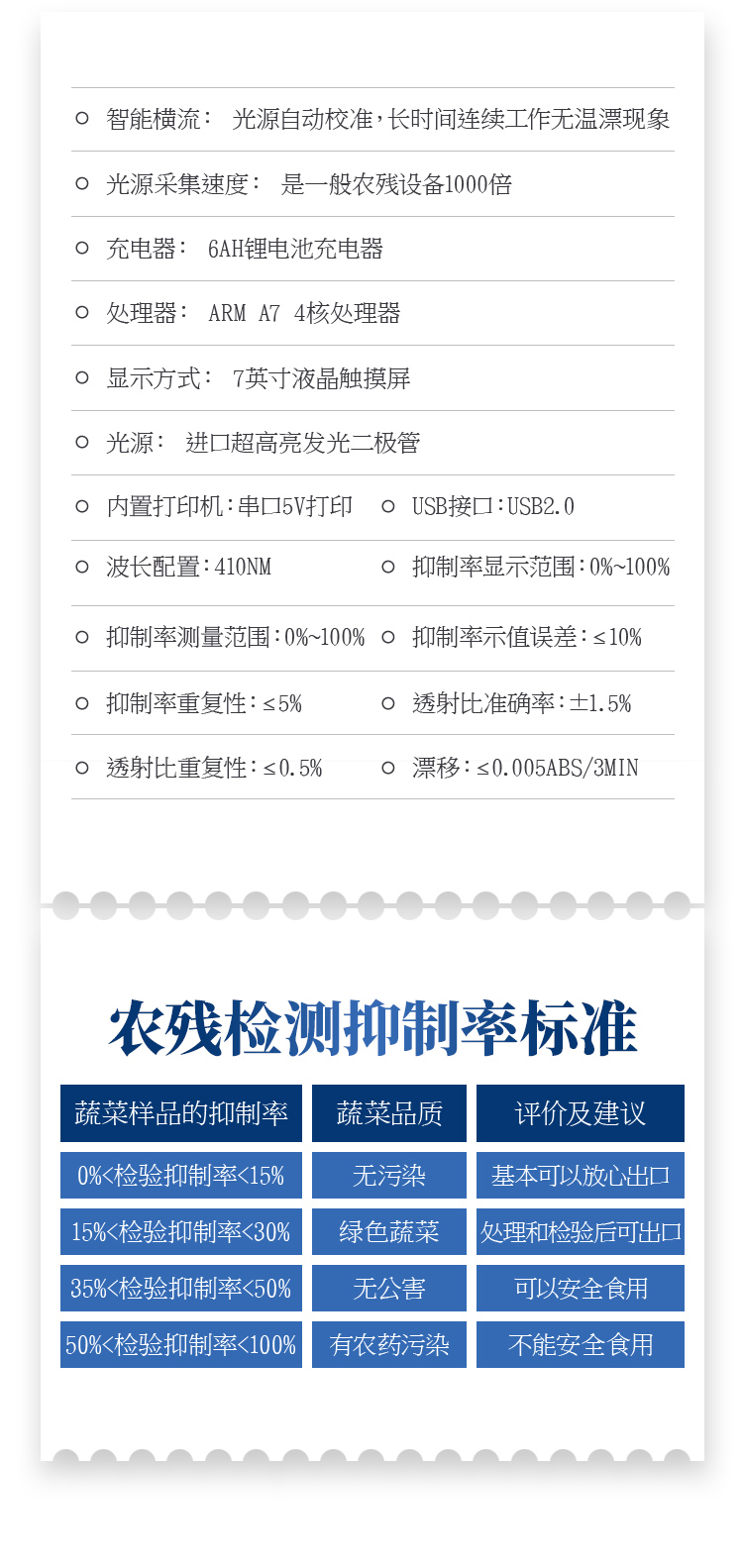檢測標(biāo)準(zhǔn):依據(jù)國家標(biāo)準(zhǔn)方法(GB/T5009.199-2003)以及世界衛(wèi)生組織WHO、世界糧農(nóng)組織FAO殘留農(nóng)藥檢測標(biāo)準(zhǔn)、世界環(huán)境保護(hù)局EPA參照攝入量等要求來設(shè)計。采用酶抑制率比色法對水果、蔬菜等農(nóng)林產(chǎn)品中有機(jī)磷和氨基甲酸酯類農(nóng)藥含量進(jìn)行快速準(zhǔn)確的檢測,乙酰膽堿酯酶和丁酰膽堿酯酶試劑均可以使用,符合國家標(biāo)準(zhǔn)和農(nóng)業(yè)部標(biāo)準(zhǔn)的要求。