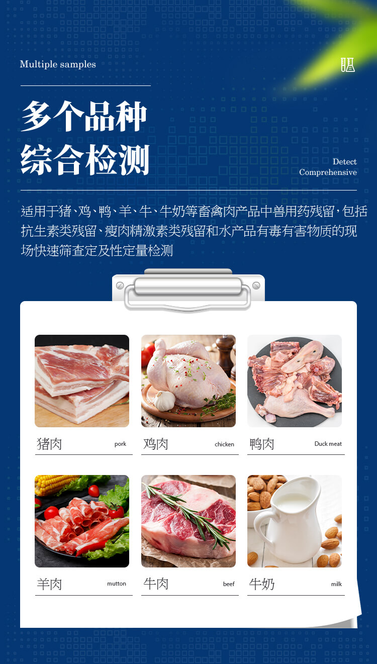 該獸藥殘留檢測(cè)儀適用于豬、雞、鴨、羊、牛、牛奶等畜禽肉產(chǎn)品中獸藥殘留,包括抗生素類殘留、瘦肉精激素類殘留和水產(chǎn)品有毒有害物質(zhì)的現(xiàn)場(chǎng)快速篩查定及性定量檢測(cè)。