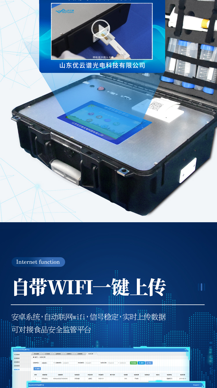 5、儀器帶有監(jiān)管平臺,數(shù)據(jù)可局域網(wǎng)和互聯(lián)網(wǎng)數(shù)據(jù)上傳,檢測結(jié)果直接傳至食品安全監(jiān)管平臺。進(jìn)行區(qū)域食品安全監(jiān)管及大數(shù)據(jù)分析處理與數(shù)據(jù)統(tǒng)計(jì),檢測區(qū)域食品安全長短期動(dòng)態(tài),達(dá)到食品安全問題預(yù)估、預(yù)警