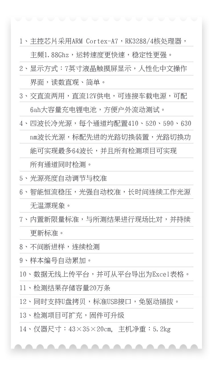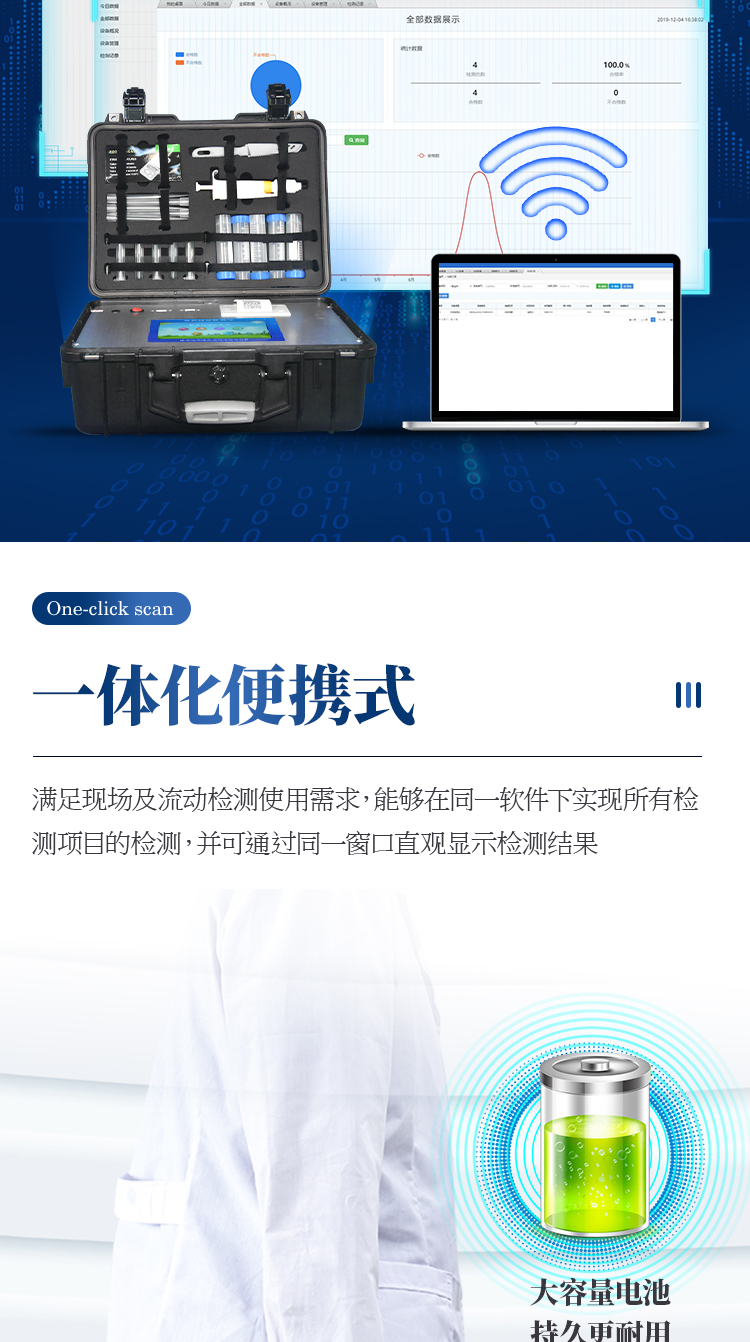 7、一體化便攜式快檢設(shè)備,滿足現(xiàn)場及流動(dòng)檢測使用需求,能夠在同一軟件下實(shí)現(xiàn)所有檢測項(xiàng)目的檢測,并可通過同一窗口直觀顯示檢測結(jié)果。