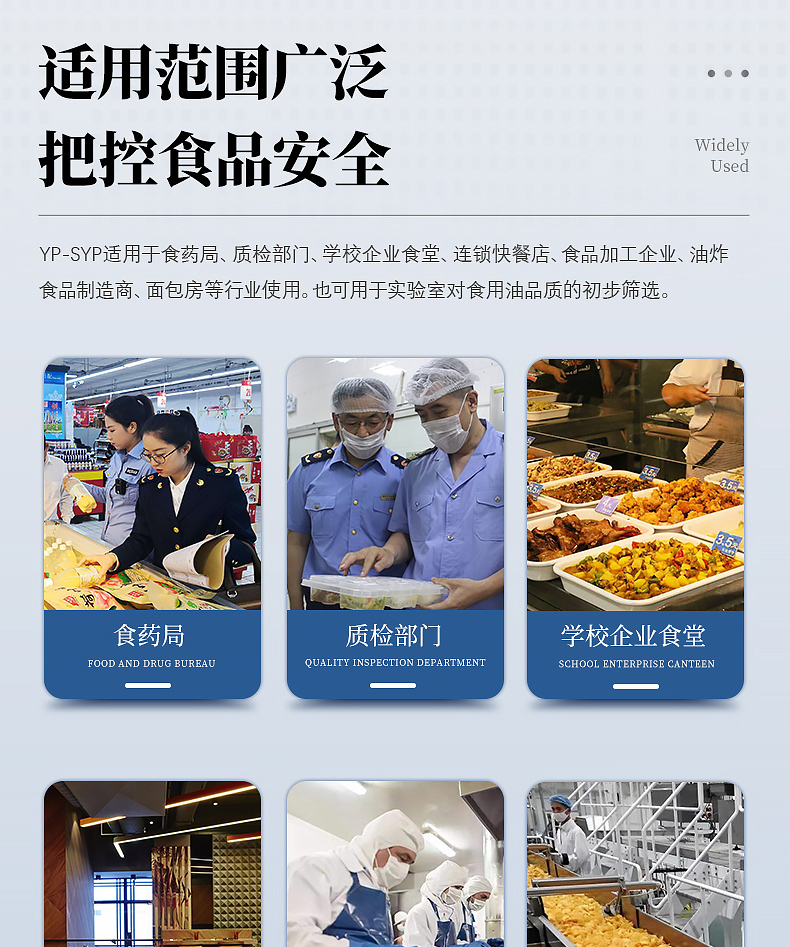YP-SYP工業(yè)版特別適合食藥局、質(zhì)檢部門、學(xué)校企業(yè)食堂、連鎖快餐店、食品加工企業(yè)、油炸食品制造商、面包房等行業(yè)使用,也可以用于實(shí)驗(yàn)室對(duì)食用油品質(zhì)的初步篩選,對(duì)劣質(zhì)油、地溝油的鑒別等。能為您達(dá)到檢驗(yàn)油品品質(zhì)、節(jié)省食用油、保證產(chǎn)品的質(zhì)量、保證食品安全的目的。