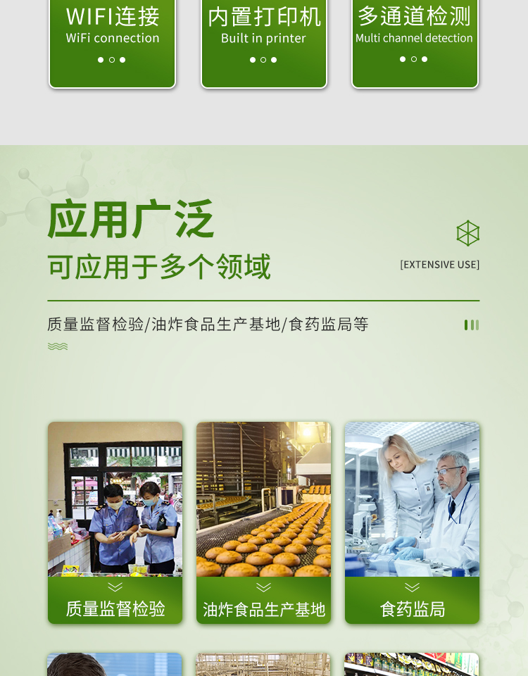 廣泛應用于質量監(jiān)督檢驗、工商管理、油炸食品生產基地、食藥監(jiān)局、衛(wèi)生部門、肉制品食品深加工企業(yè)、商場超市、各大食品安全監(jiān)測系統(tǒng)等單位使用。