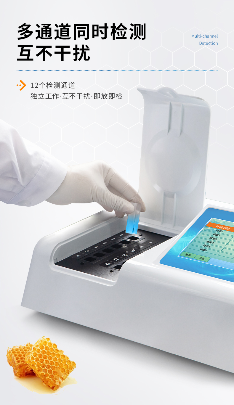 檢測項目:蜂蜜蔗糖、蜂蜜還原糖(葡萄糖和果糖)、蜂蜜羥甲基糠醛、蜂蜜酸度、蜂蜜中農(nóng)藥殘留、蜂蜜淀粉酶值、蜂蜜中脯氨酸、蜂蜜水分、蜂蜜糖分、蜂蜜中重金屬(鉛、鎘、汞)、蜂蜜中抗生素(氯霉素、四環(huán)素、磺胺類、呋喃類、喹諾酮類)、蜂蜜中灰分,應(yīng)用范圍:應(yīng)用于現(xiàn)場檢測蜂蜜蔗糖、葡萄糖和果糖、羥甲基糠醛、酸度、農(nóng)殘、淀粉酶、脯氨酸、水分、糖分、重金屬、抗生素、灰分含量的蜂蜜快速檢測儀,可廣泛應(yīng)用于各類蜂蜜品質(zhì)的快速定量檢測。
