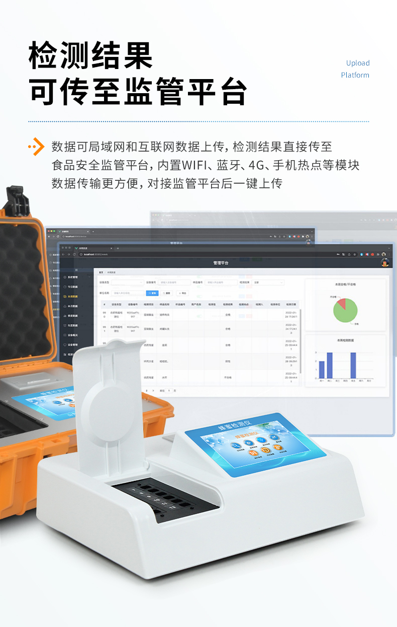 4、儀器帶有監(jiān)管平臺,數(shù)據(jù)可局域網(wǎng)和互聯(lián)網(wǎng)數(shù)據(jù)上傳,檢測結(jié)果直接傳至食品安全監(jiān)管平臺。進行區(qū)域食品安全監(jiān)管及大數(shù)據(jù)分析處理與數(shù)據(jù)統(tǒng)計,檢測區(qū)域食品安全長短期動態(tài),達(dá)到食品安全問題預(yù)估、預(yù)警