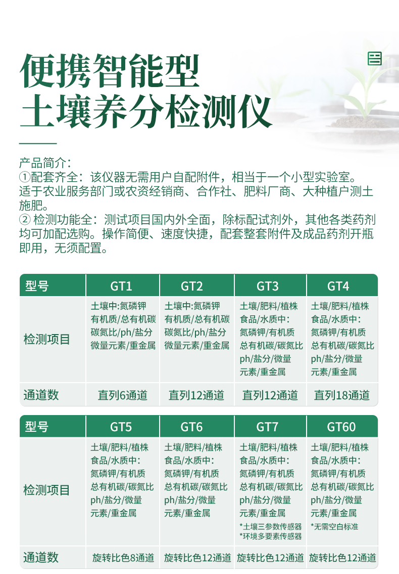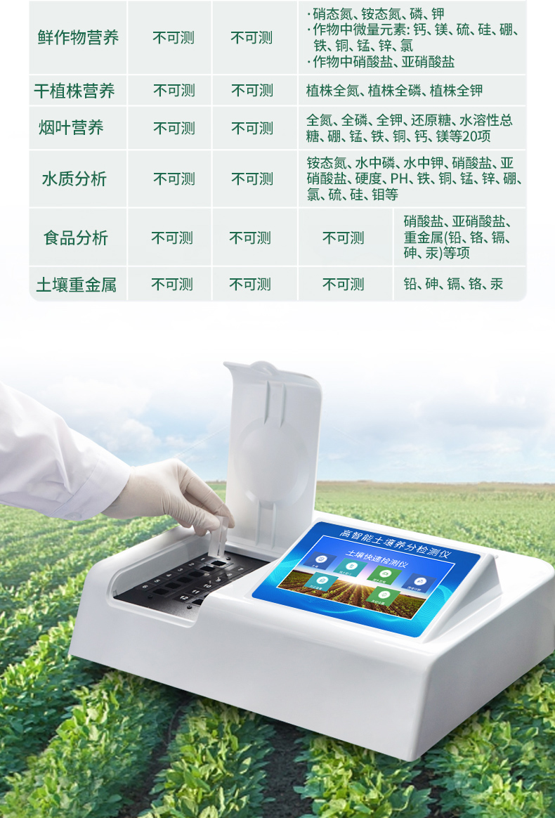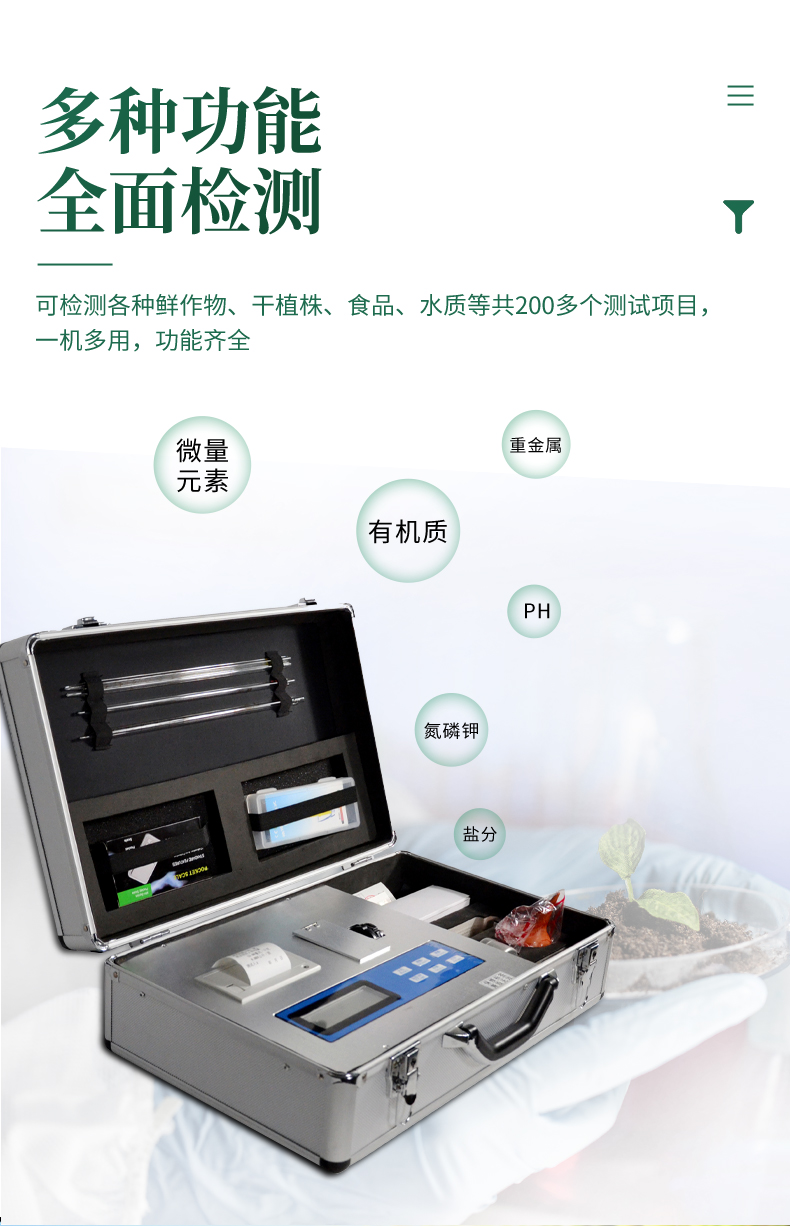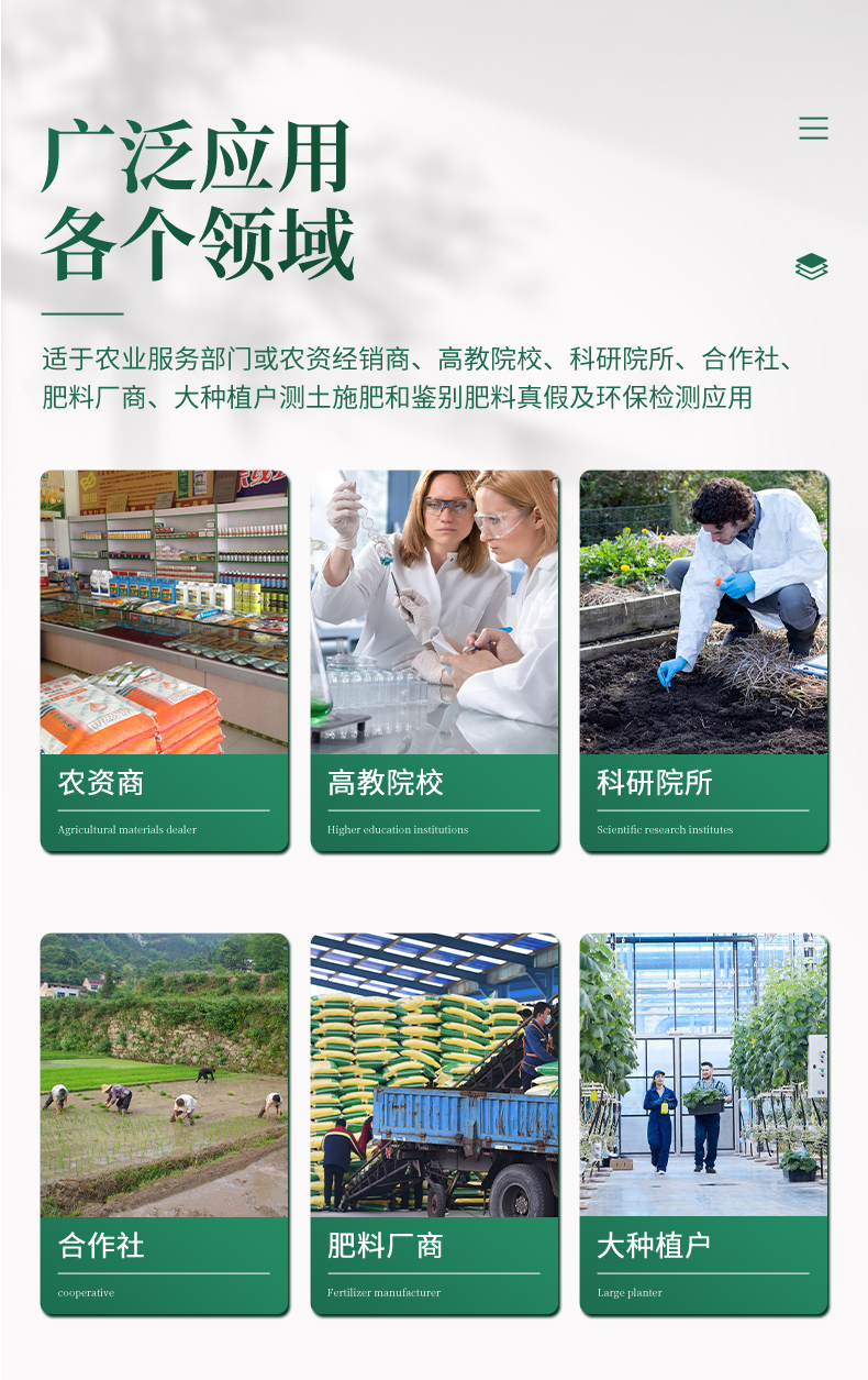 4、可檢測土壤及化肥、有機肥、植株中的速效氮、有效磷、速效鉀、全氮、全磷、全鉀、有機質(zhì)含量,土壤酸堿度,含鹽量,以及土壤鈣、鎂、硫、硼、氯、硅等6種中微量元素。