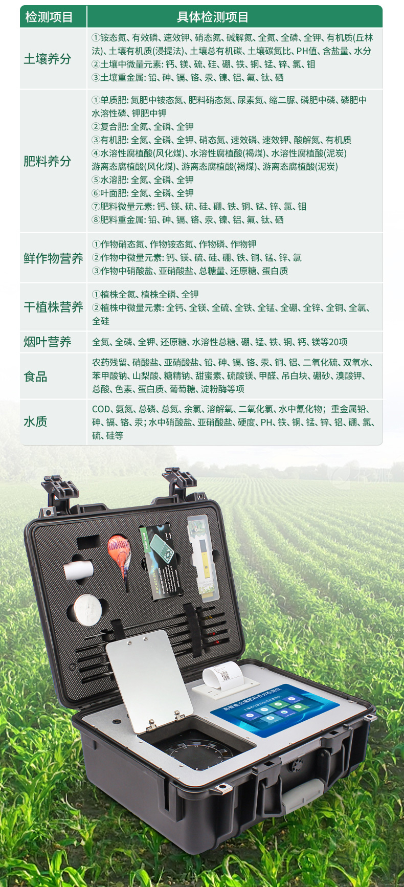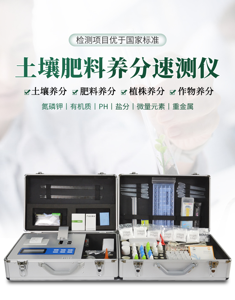 配套齊全:該儀器集藥、器、儀為一體,攜帶方便,相當于一個小型實驗室。適于農(nóng)業(yè)服務部門或農(nóng)資經(jīng)銷商、肥料廠商測土施肥和鑒別肥料真假。