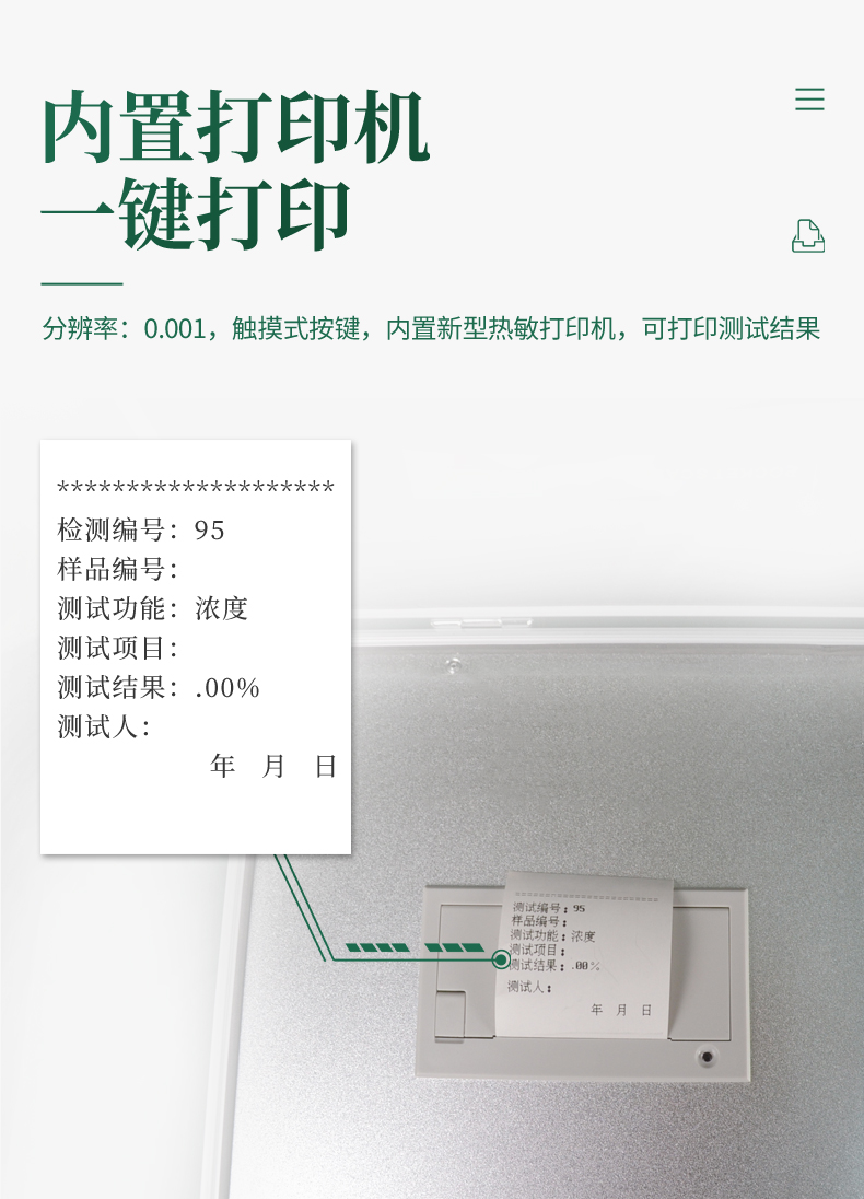 3、分辨率:0.001,觸摸式按鍵,內(nèi)置熱敏打印機,可打印測試結果。