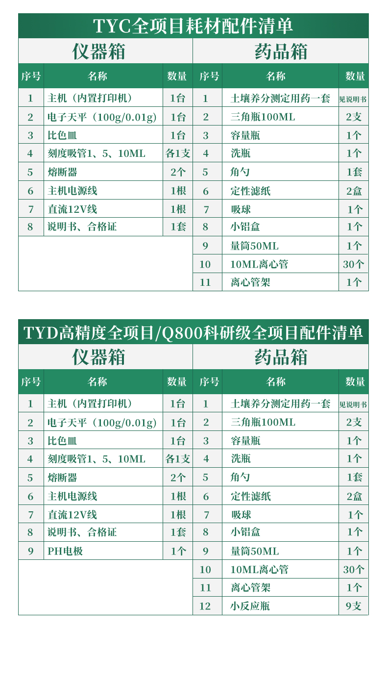 01 | 主機(內(nèi)置打印機) | 1臺 | 01 | 土壤養(yǎng)分測定用藥 | 1套/100次 |