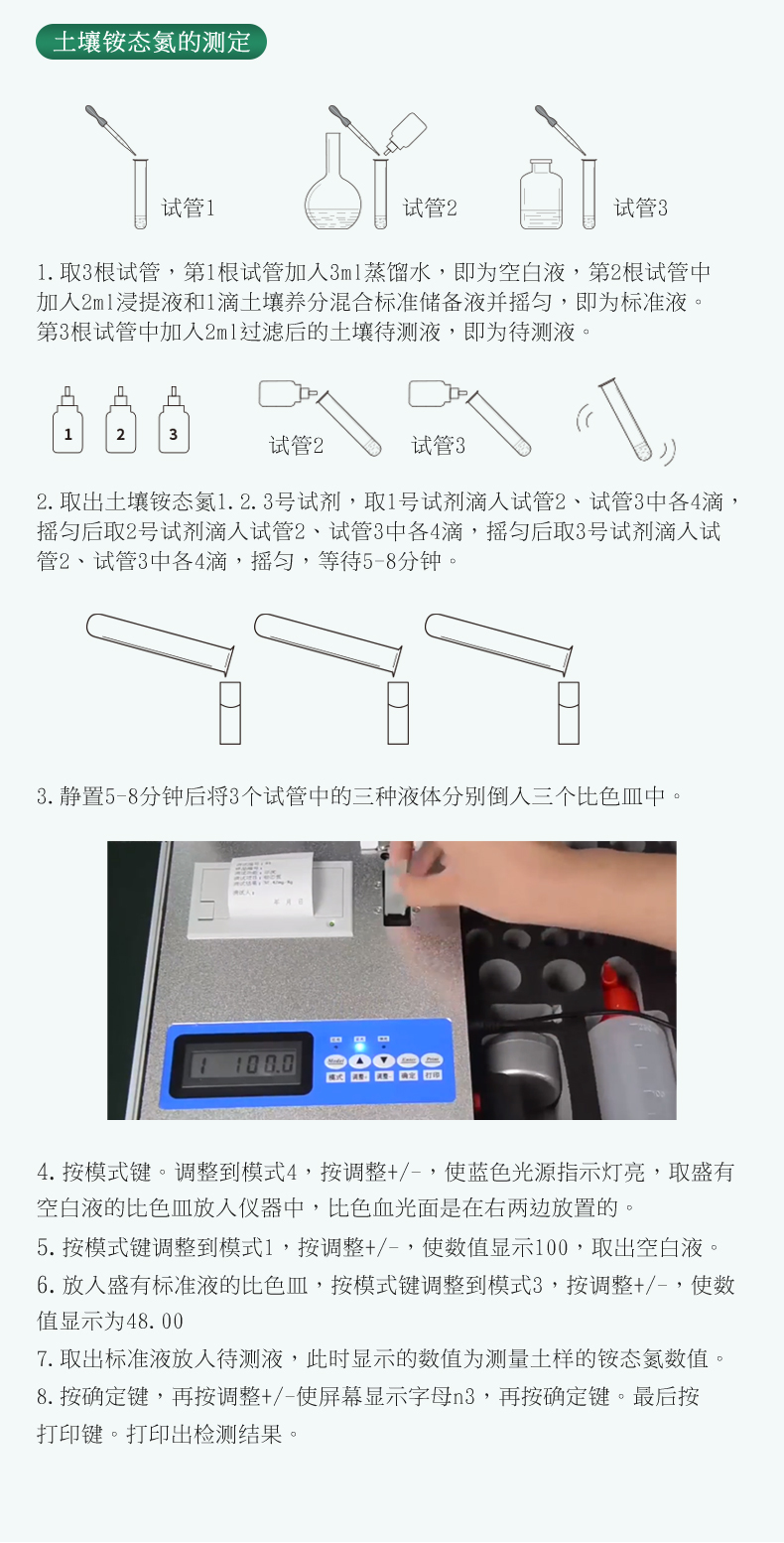 測一個肥料(N、P、K)≤50分鐘,同時檢測三個土樣(N、P、K)≤1.5小時。