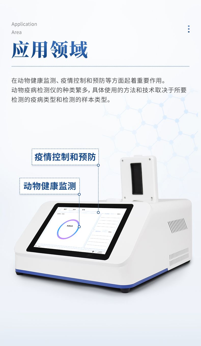 動(dòng)物/寵物疫病檢測(cè)儀是一種用于檢測(cè)動(dòng)物身體樣本中是否存在病原體或疫病的設(shè)備。它在動(dòng)物健康監(jiān)測(cè)、疫情控制和預(yù)防等方面起著重要作用。動(dòng)物疫病檢測(cè)儀的種類(lèi)繁多,具體使用的方法和技術(shù)取決于所要檢測(cè)的疫病類(lèi)型和檢測(cè)的樣本類(lèi)型。