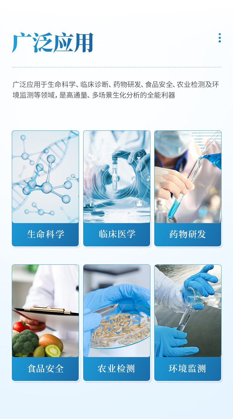 全光譜酶標(biāo)儀主要應(yīng)用于生命科學(xué)與醫(yī)學(xué)研究領(lǐng)域,是進(jìn)行蛋白質(zhì)定量、核酸濃度測(cè)量、酶動(dòng)力學(xué)研究、細(xì)胞活性與毒性檢測(cè)以及ELISA實(shí)驗(yàn)的基石,廣泛應(yīng)用于高校、科研院所和醫(yī)院實(shí)驗(yàn)室。在醫(yī)藥與生物技術(shù)行業(yè),它是藥物研發(fā)過(guò)程中進(jìn)行高通量篩選、藥效毒理評(píng)估及生物制品質(zhì)量控制的必備工具;在農(nóng)業(yè)與食品安全領(lǐng)域,用于檢測(cè)作物病害、食品中的過(guò)敏原、毒素及農(nóng)藥殘留;在環(huán)境監(jiān)測(cè)方面,它還可用于分析水體和土壤中的污染物,成為保障公共安全的重要工具。