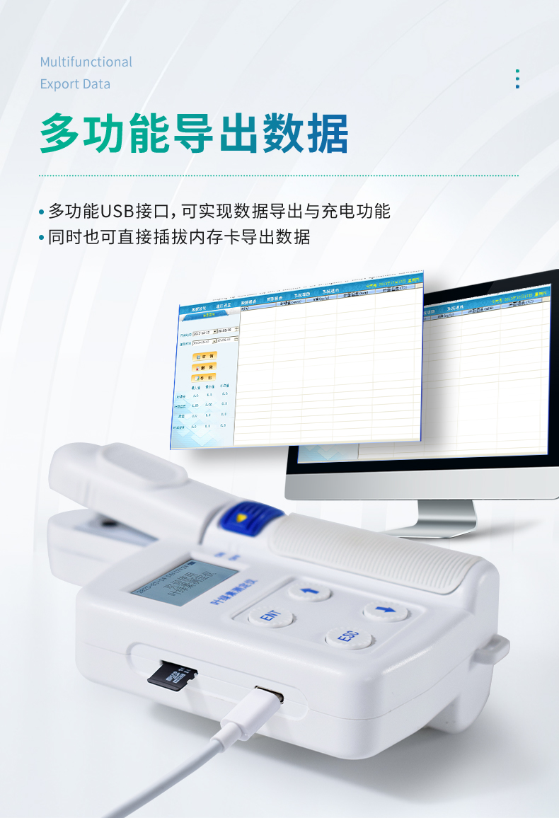 4.多功能USB接口,可實(shí)現(xiàn)數(shù)據(jù)導(dǎo)出與充電功能,可將儀器與電腦直接聯(lián)機(jī),數(shù)據(jù)導(dǎo)出無(wú)需上位機(jī)軟件,還可選擇使用內(nèi)存卡直接導(dǎo)出數(shù)據(jù),操作簡(jiǎn)單方便