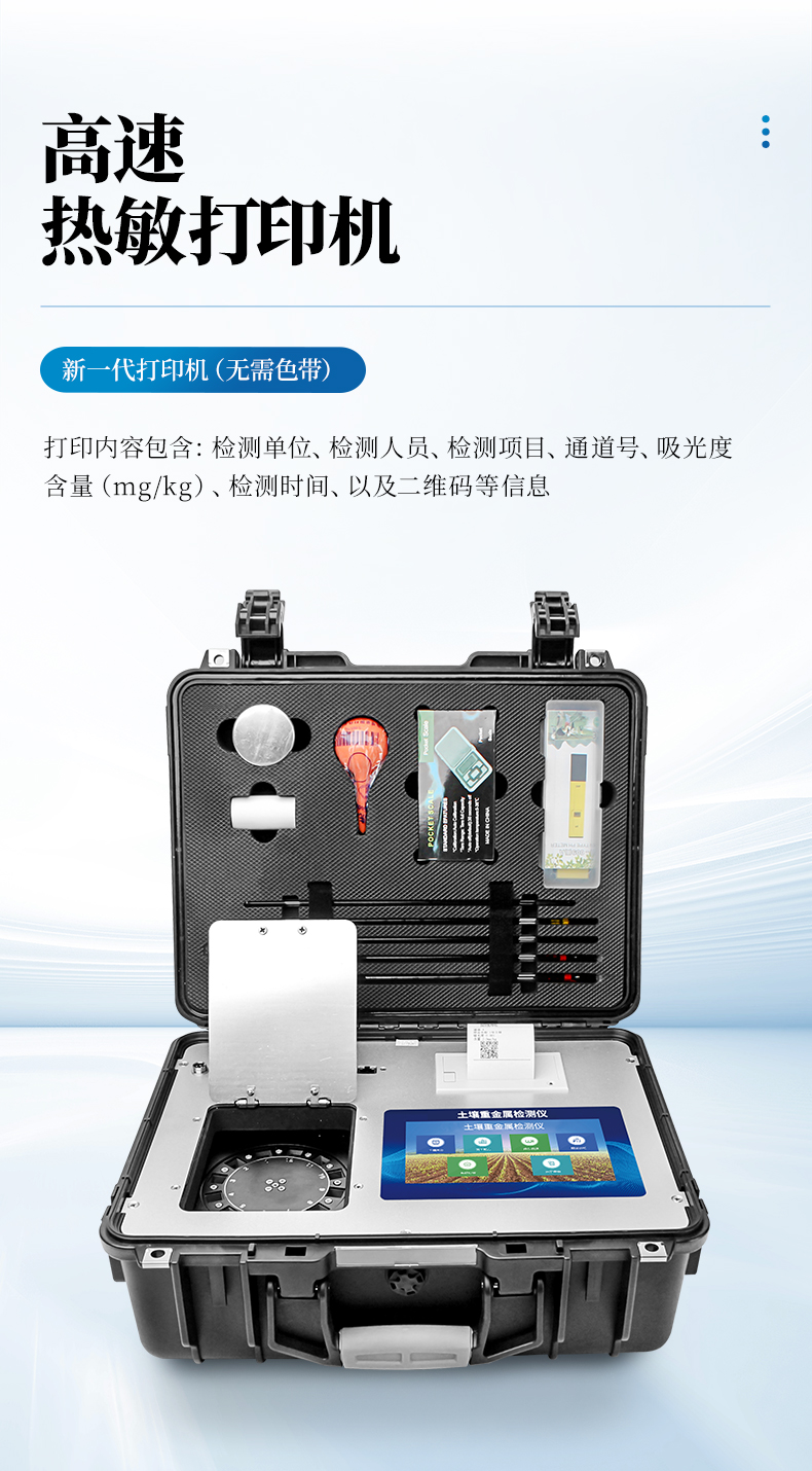 12、內(nèi)置新一代高速熱敏打印機(無需色帶),打印內(nèi)容包含:檢測單位、檢測人員、檢測項目、通道號、吸光度、含量(mg/kg)、檢測時間、以及二維碼等信息