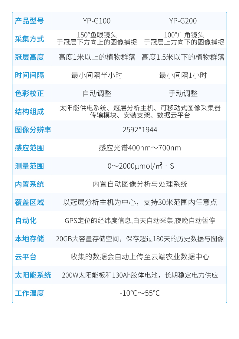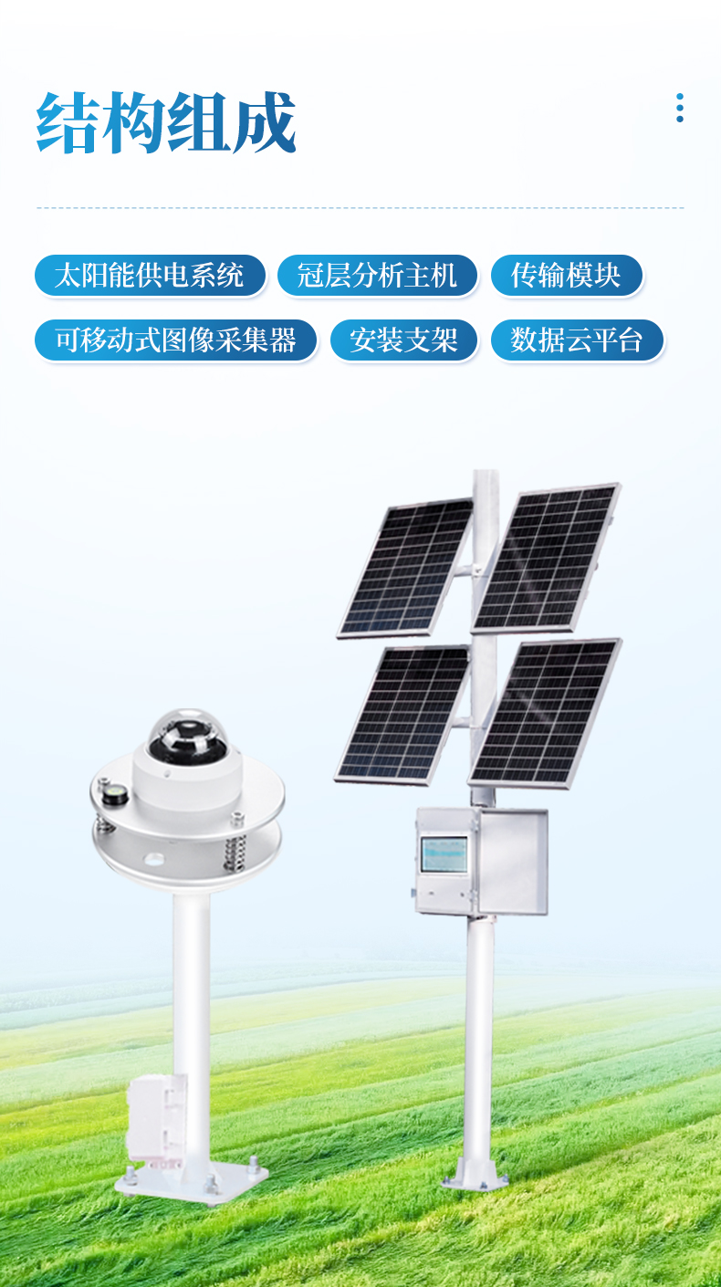 太陽能供電系統(tǒng)、冠層分析主機(jī)、可移動(dòng)式圖像采集器(含150°魚眼鏡頭)、傳輸模塊、安裝支架、數(shù)據(jù)云平臺(tái)