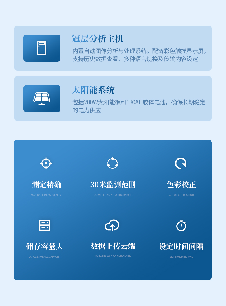 太陽能系統(tǒng): 包括200W太陽能板和130Ah膠體電池,確保長期穩(wěn)定的電力供應(yīng)