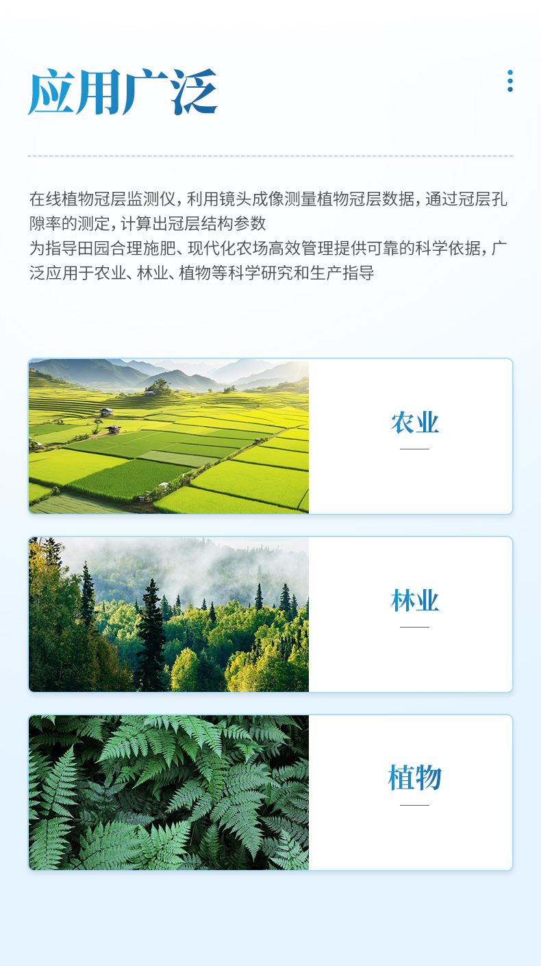 在線植物冠層監(jiān)測儀是一款用于實(shí)時(shí)監(jiān)測植物冠層狀態(tài)的設(shè)備,利用魚眼鏡頭成像測量植物冠層數(shù)據(jù),通過冠層孔隙率的測定,計(jì)算出冠層結(jié)構(gòu)參數(shù);這是目前世界上各種冠層儀一致采用的原理,該方法是各類方法中精確、省力、省時(shí)、快捷方便的方法。為指導(dǎo)田園合理施肥、現(xiàn)代化農(nóng)場高效管理提供可靠的科學(xué)依據(jù),廣泛應(yīng)用于農(nóng)業(yè)、林業(yè)、植物等科學(xué)研究和生產(chǎn)指導(dǎo)。
