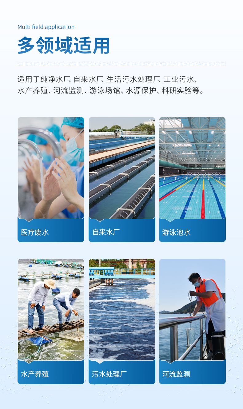 適用于純凈水廠、自來水廠、生活污水處理廠、工業(yè)污水、水產養(yǎng)殖、河流監(jiān)測、游泳場館、水源保護、生產監(jiān)測、科研實驗等。