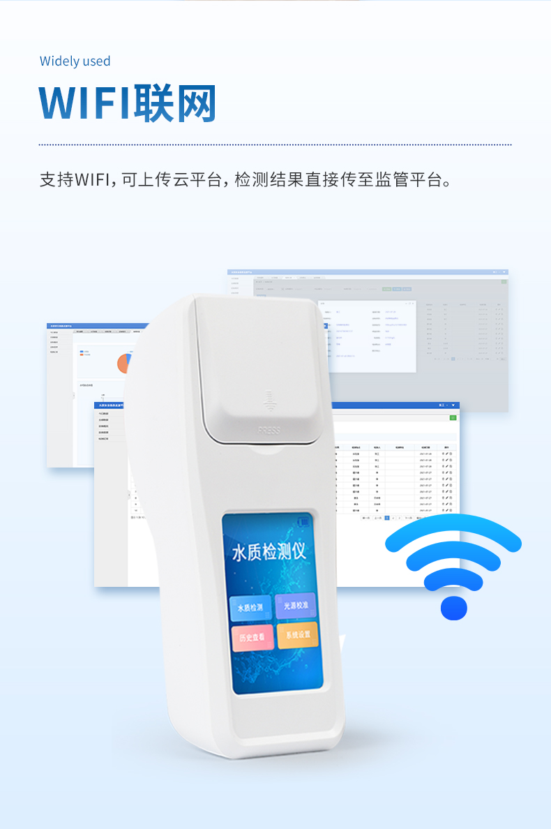 ②配置云監(jiān)控平臺,檢測結果可直接無線傳至平臺,進行水質長短期分析,輔助管理。