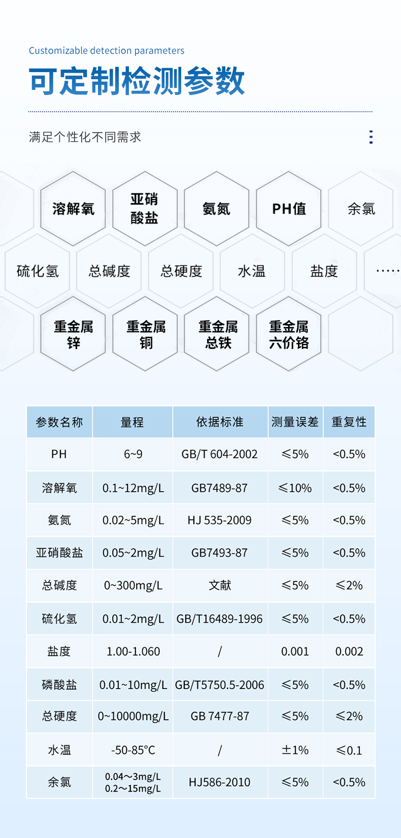 氨氮、亞硝酸鹽、余氯、總氯、二氧化氯、亞氯酸鹽、臭氧、pH、溶解氧、硫化氫、磷酸鹽、硫酸鹽、尿素、氰尿酸、總硬度、總堿度、濁度、懸浮物、水溫、鹽度、氯化物、色度、有效氯等20多種檢測指標;
