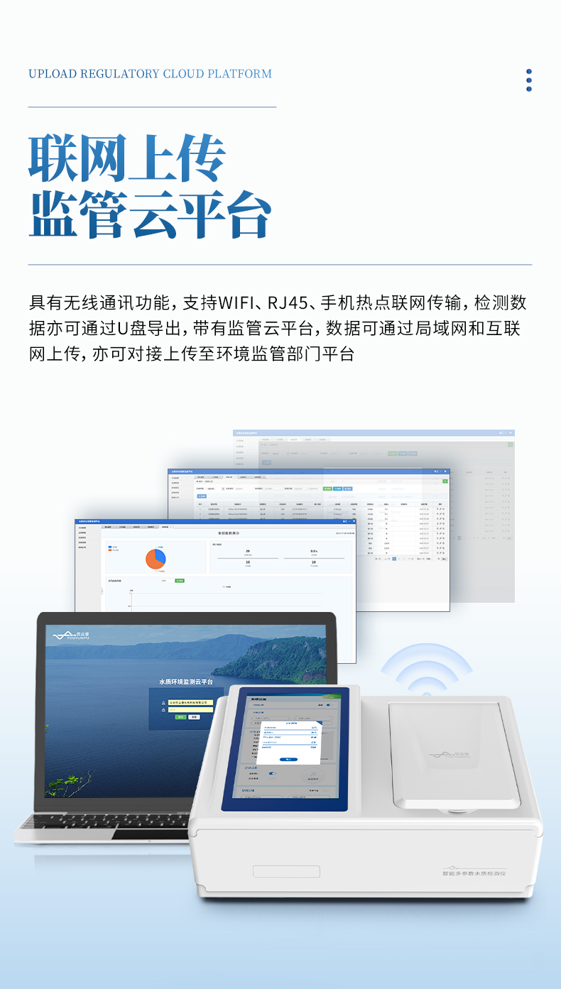10、儀器帶有監(jiān)管云平臺(tái),數(shù)據(jù)可通過局域網(wǎng)和互聯(lián)網(wǎng)上傳,亦可對接上傳至環(huán)境監(jiān)管部門平臺(tái)。