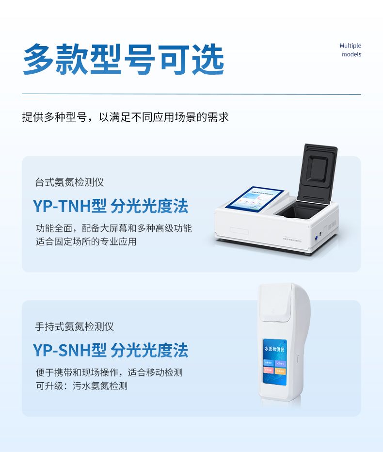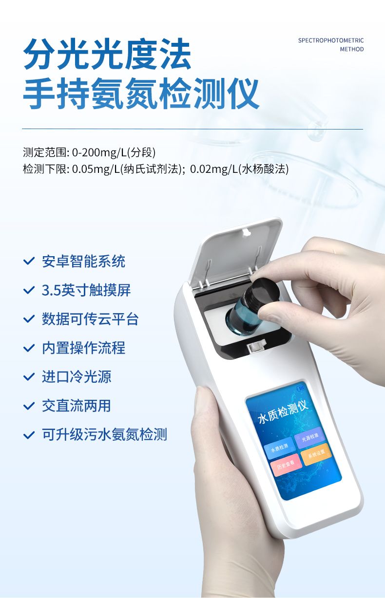 智能氨氮快速檢測儀主要檢測水體中的氨氮含量;設備內(nèi)置多個光源,對應不同的檢測波長,可同時滿足納氏試劑法和水楊酸法檢測水體中的氨氮含量。納氏試劑法參考環(huán)境標準HJ 535-2009 《水質(zhì) 氨氮的測定 納氏試劑分光光度法》,水楊酸法參考環(huán)境標準HJ 536-2009 《水質(zhì) 氨氮的測定 水楊酸分光光度法》。本儀器兼具智能數(shù)據(jù)分析功能,圖表、列表顯示數(shù)據(jù),分析一目了然;高清晰度彩色液晶觸摸顯示屏,Android智能操作系統(tǒng),中文顯示界面,中英文鍵盤,人性化操作,使用更簡單。