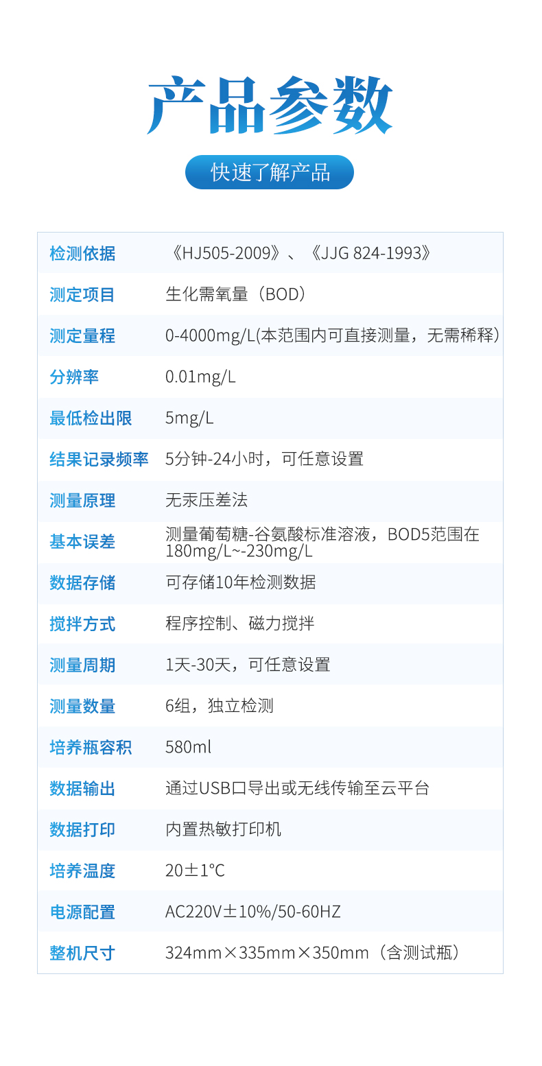BOD生化需氧量測(cè)定儀是根據(jù)國(guó)家標(biāo)準(zhǔn)《HJ505-2009》5日培養(yǎng)法,模擬自然界中有機(jī)物的生物降解過程,采用簡(jiǎn)單、安全、可靠的無汞壓差感測(cè)法測(cè)量水中BOD;全智能化設(shè)計(jì),領(lǐng)先的研發(fā)工藝和設(shè)計(jì)制造,實(shí)驗(yàn)過程無需實(shí)驗(yàn)人員值守;適用于排污企業(yè)、環(huán)境監(jiān)測(cè)、污水處理廠、第三方檢測(cè)機(jī)構(gòu)、科研、高校等領(lǐng)域的生化需氧量測(cè)定。
