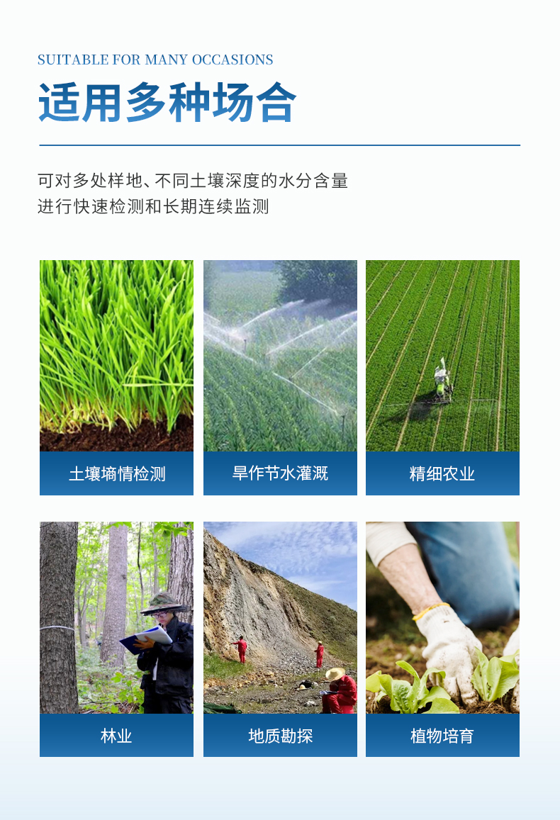 廣泛應(yīng)用于土壤墑情檢測(cè)、旱作節(jié)水灌溉、精細(xì)農(nóng)業(yè)、林業(yè)、地質(zhì)勘探、植物培育、水利、環(huán)保等領(lǐng)域。