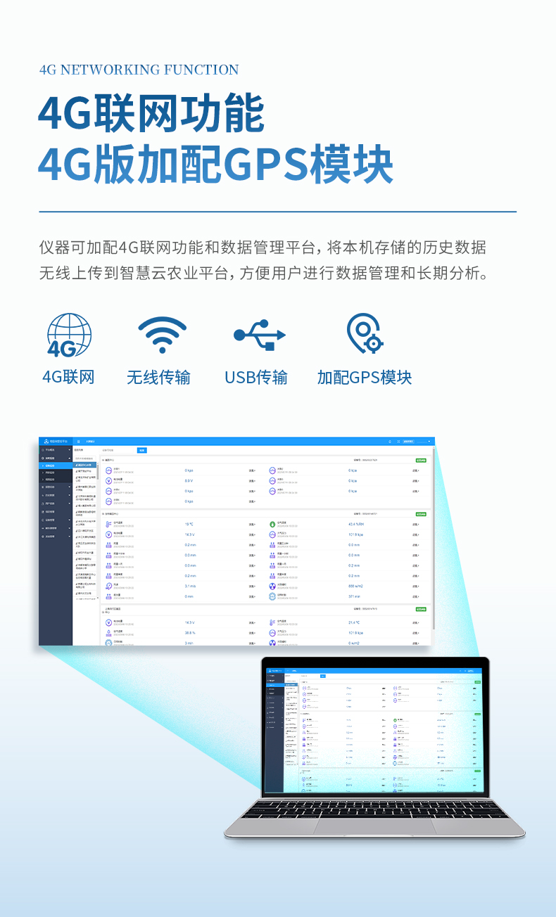 7、儀器配備4G聯(lián)網(wǎng)功能數(shù)據(jù)管理平臺,將本機(jī)存儲的被測點(diǎn)環(huán)境因子測量歷史數(shù)據(jù)無線上傳到智慧云農(nóng)業(yè)平臺,方便用戶進(jìn)行數(shù)據(jù)管理和長期分析。