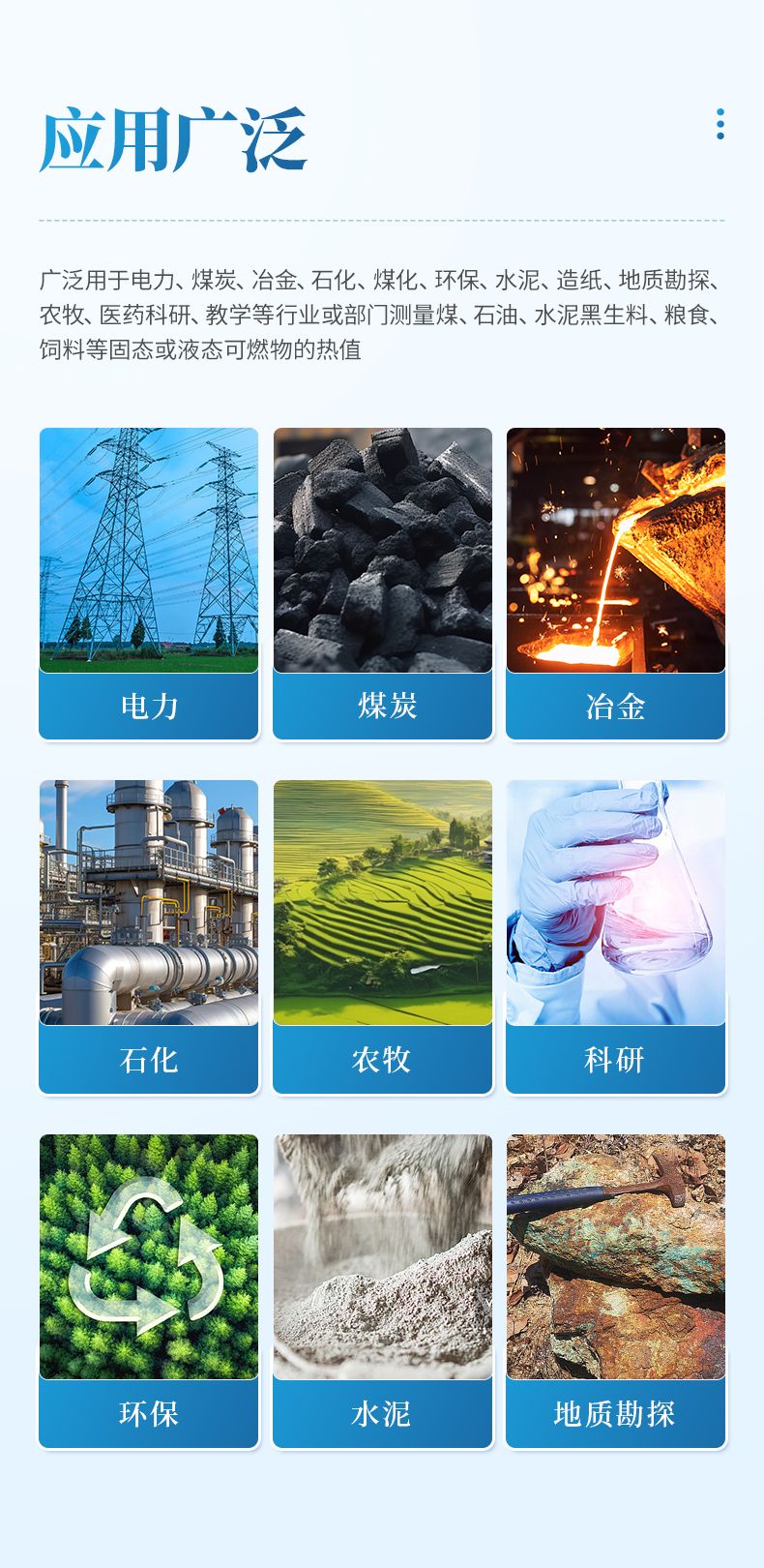適用于生產(chǎn)、研究和使用可燃物質(zhì)的企業(yè)、大專院校、科研部門及軍工單位用來測(cè)定 煤炭、焦炭、化工、糧食、木材、飼料等可燃物質(zhì)的發(fā)熱量和火藥的爆熱值。