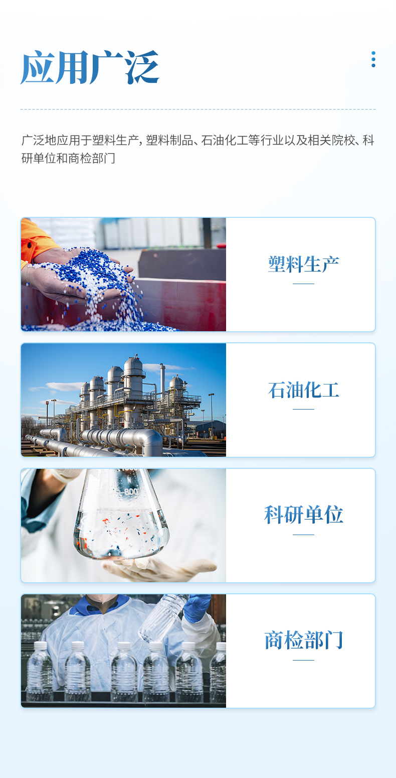 用于測定各種塑膠、樹脂在粘流狀態(tài)時(shí)熔體流動(dòng)速率MFR值,它既適用于熔融溫度較高的聚碳酸酯、聚芳砜、氟塑料、尼龍等工程塑料,也適用于聚乙烯(PE)、聚苯乙烯(PS)、聚丙烯(PP)、ABS樹脂、聚甲醛(POM)、聚碳酸酯(PC)樹脂等熔融溫度較低的塑料測試,廣泛地應(yīng)用于塑料生產(chǎn),塑料制品、石油化工等行業(yè)以及相關(guān)院校、科研單位和商檢部門。