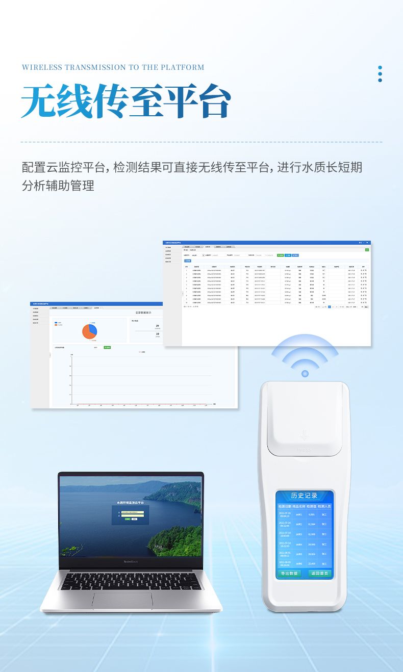 ②配置云監(jiān)控平臺(tái),檢測(cè)結(jié)果可直接無(wú)線傳至平臺(tái),進(jìn)行水質(zhì)長(zhǎng)短期分析,輔助管理。