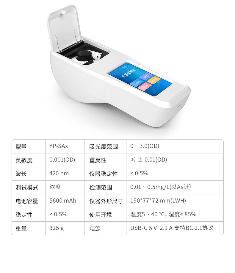 水中砷檢測儀是一款基于分光光度法原理研發(fā)的智能化水中總砷檢測儀,專門用于飲用水、地表水、地下水及廢水中總砷的快速定量分析。儀器采用高性能LED光源與大面積光電池,結(jié)合優(yōu)化的硝酸銀-聚乙烯醇吸收顯色體系,確保了在420nm波長下檢測的高靈敏度與穩(wěn)定性。其搭載的Android智能操作系統(tǒng)與,使操作直觀流暢;具備萬條數(shù)據(jù)存儲、Wi-Fi/藍(lán)牙傳輸及防水機(jī)身,非常適合實(shí)驗(yàn)室與現(xiàn)場檢測場景。儀器支持多點(diǎn)標(biāo)定與內(nèi)置曲線,配合Type-C通用充電與長續(xù)航設(shè)計(jì),為用戶提供了準(zhǔn)確、便捷、可靠的一體化砷檢測解決方案。