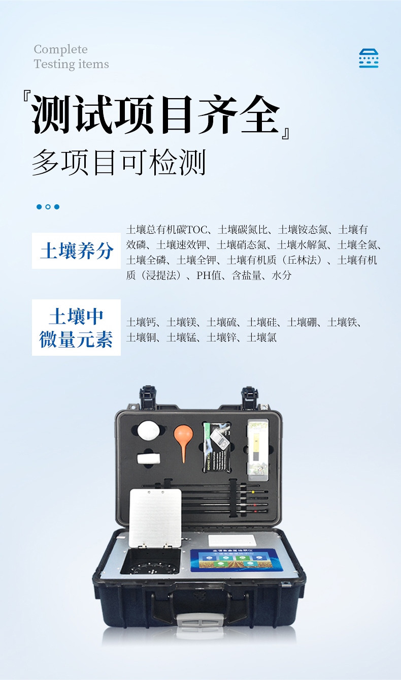 1、土壤養(yǎng)分:●土壤碳氮比、土壤銨態(tài)氮、土壤有效磷、土壤速效鉀、土壤硝態(tài)氮、土壤水解氮、土壤全氮、土壤全磷、土壤全鉀、土壤有機質(zhì)(丘林法)、土壤有機質(zhì)(浸提法)、PH值、含鹽量、水分?!裢寥乐形⒘吭兀和寥棱}、土壤鎂、土壤硫、土壤硅、土壤硼、土壤鐵、土壤銅、土壤錳、土壤鋅、土壤氯。