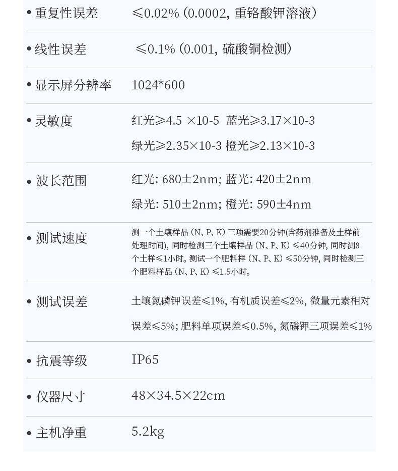 測試一個肥料樣(N、P、K)≤50分鐘,同時檢測三個肥料樣品(N、P、K)≤1.5小時。