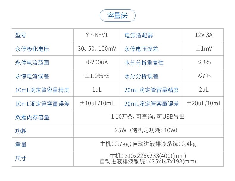 本卡爾費休水分儀(容量滴定法)的測量精度符合JJG 1154-2018《卡爾·費休容量法水分測定儀檢定規(guī)程》規(guī)定。