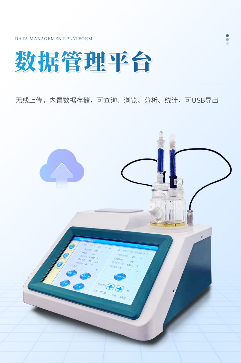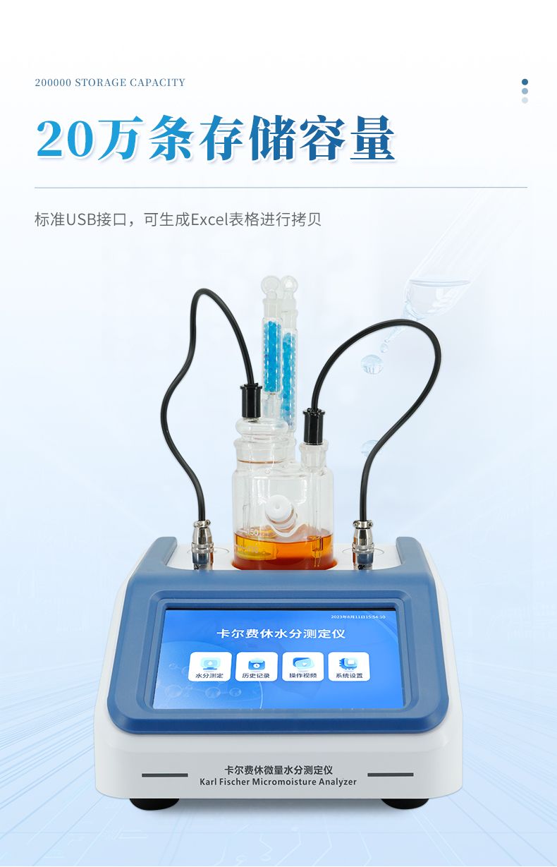 2.儀器具有試驗結(jié)果存儲、打印、計算功能;樣品測定過程由儀器自動控制,攪拌、測定60秒左右自動完成,直接顯示測定結(jié)果;全密封滴定池瓶,避免試劑與人接觸,也避免環(huán)境濕度的影響;儀器中文液晶顯示,并具有自動計算和打印功能,能打印出百分含量、樣品編號、試驗員、實驗日期等內(nèi)容;儀器準確度為:①水含量小于10微克水時,測量值誤差小于2ug水;②水含量在10微克-1000微克水時,測量誤差≤2ug水;③水含量在1000微克以上時,測量值誤差≤0.2%(不含進樣誤差);