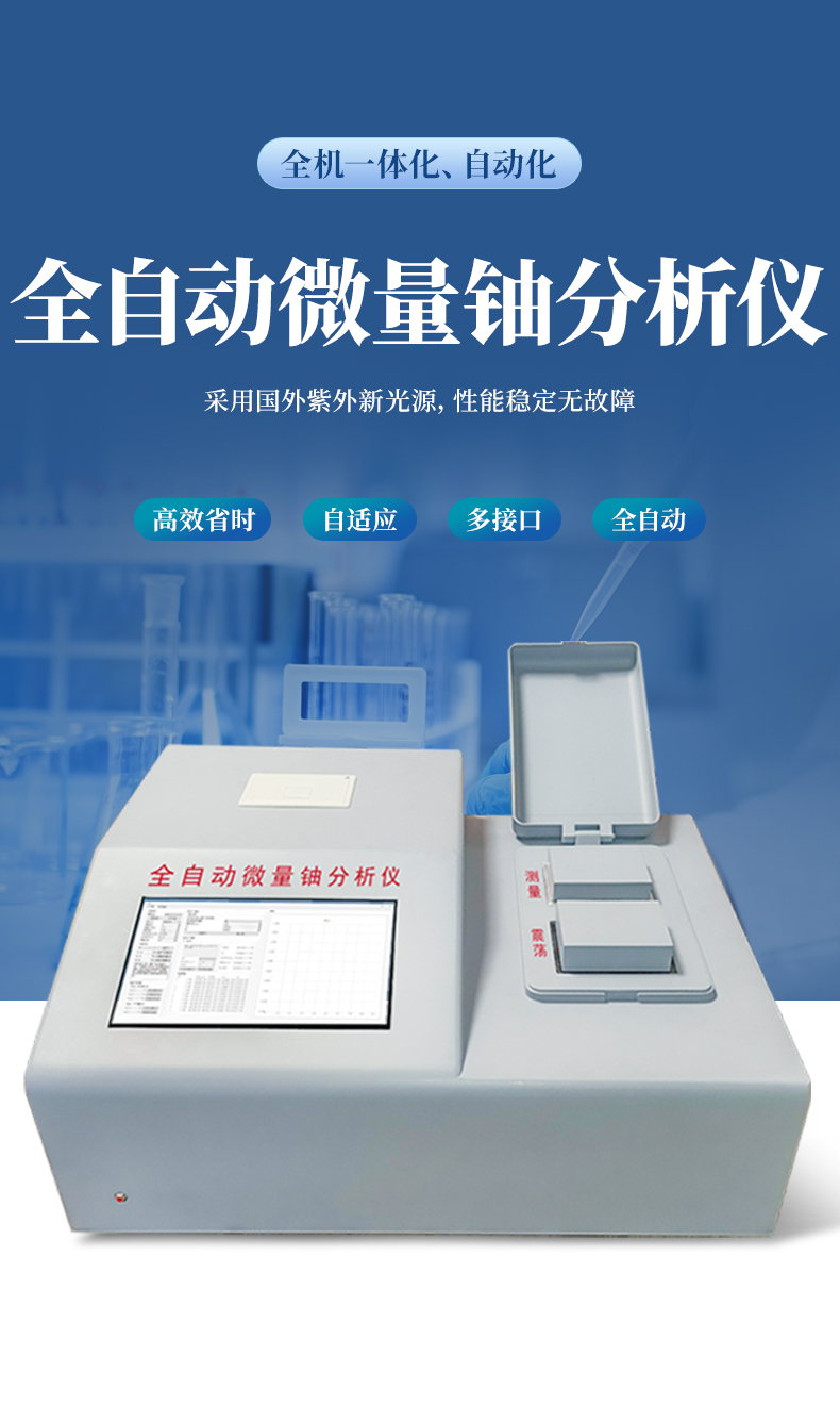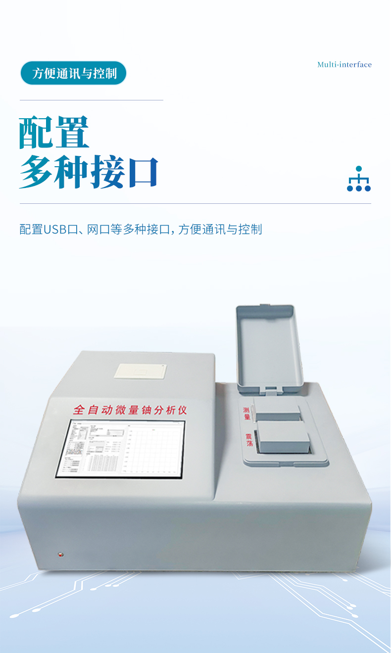 為了滿足核工業(yè)、輻射環(huán)保及科學(xué)研究等單位監(jiān)測(cè)微量鈾樣品的需要,我公司最新研制成功全自動(dòng)微量鈾分析儀。儀器設(shè)計(jì)采用國(guó)外著名公司生產(chǎn)的紫外新光源,該光源的主要特點(diǎn)是性能穩(wěn)定無(wú)故障;所用的脈沖光管壽命≥5 年,如用標(biāo)準(zhǔn)加入法能分析8萬(wàn)個(gè)樣品。電路設(shè)計(jì)采用新型的單片機(jī),測(cè)試時(shí)的所有操作只要按中文提示輕輕點(diǎn)擊液晶觸摸屏上的對(duì)應(yīng)選項(xiàng),設(shè)備內(nèi)置震蕩功能,避免了外部使用振蕩器的問(wèn)題,全機(jī)一體化、自動(dòng)化。震蕩完成后可選擇就可用標(biāo)準(zhǔn)加入法、工作曲線法分析樣品。并由單片機(jī)自動(dòng)作出回歸曲線,線性回歸方程式,直接進(jìn)行數(shù)據(jù)處理,液晶屏顯示及打印機(jī)打印能同時(shí)給出樣品測(cè)試的最終結(jié)果。該儀器設(shè)有以太網(wǎng)100Base-T4網(wǎng)口。可把測(cè)試數(shù)據(jù)直接輸入計(jì)算機(jī),是同類儀器的升級(jí)換代產(chǎn)品。
