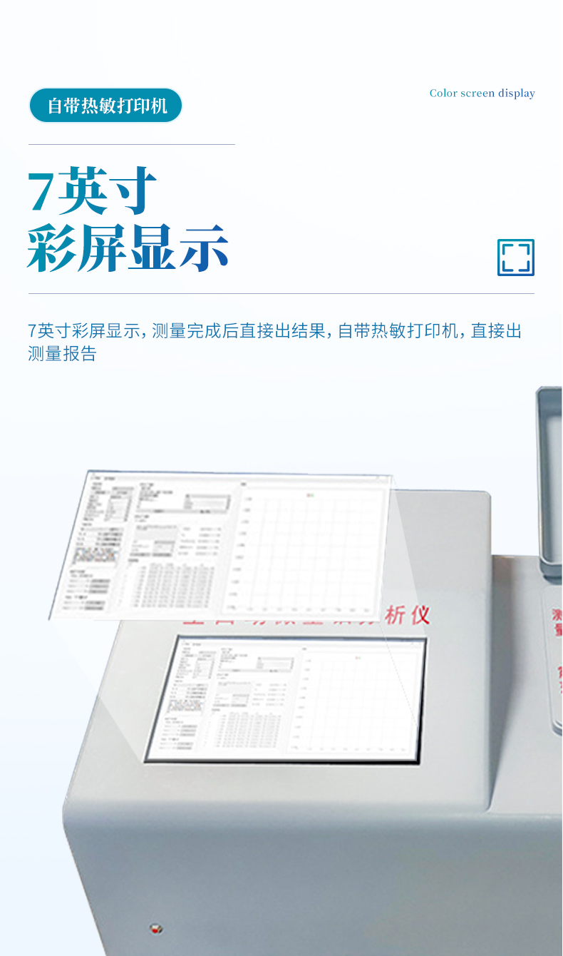 7寸彩屏顯示,測(cè)量完成后直接出結(jié)果,自帶熱敏打印機(jī),直接出測(cè)量報(bào)告。