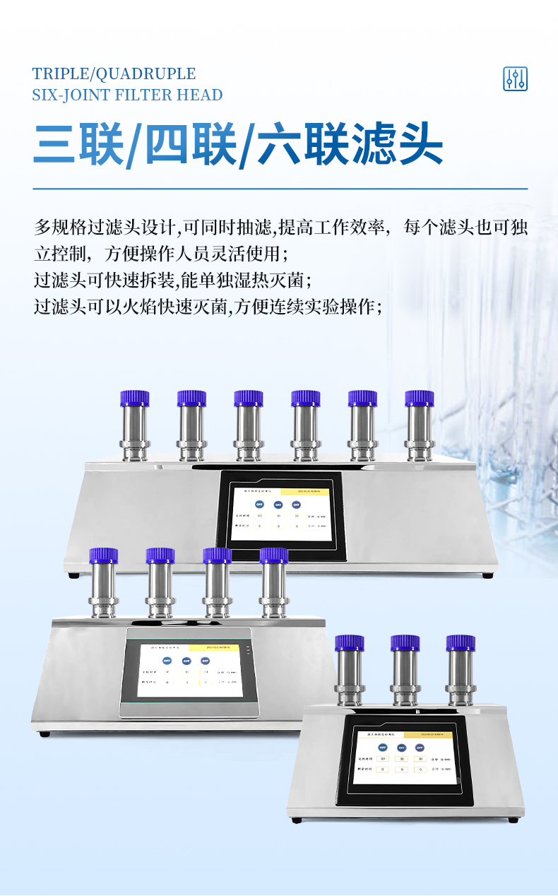 7.多規(guī)格過濾頭設(shè)計,可同時抽濾,提高工作效率,每個濾頭也可獨(dú)立控制,方便操作人員靈活使用;