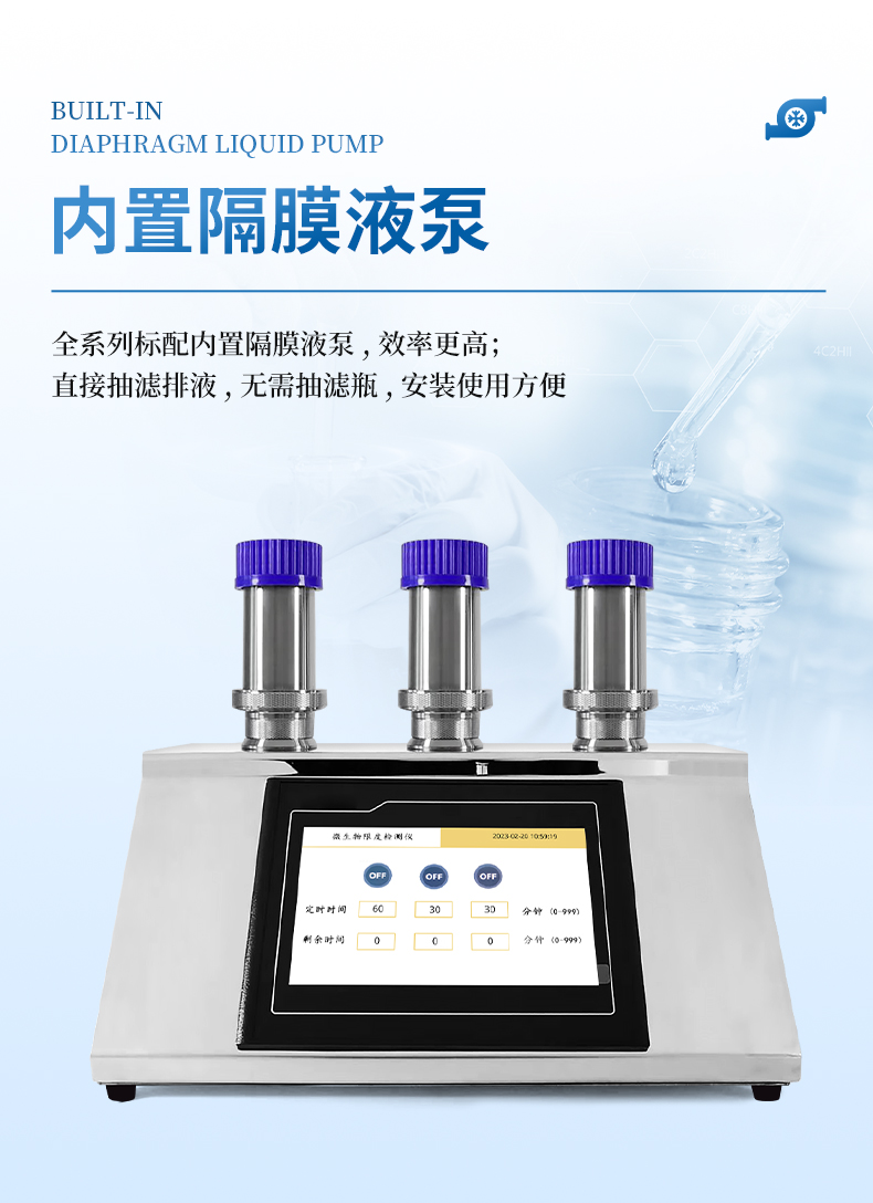 | 抽濾方式 | 內(nèi)置隔膜液泵負(fù)壓抽濾,無需抽氣瓶 |
